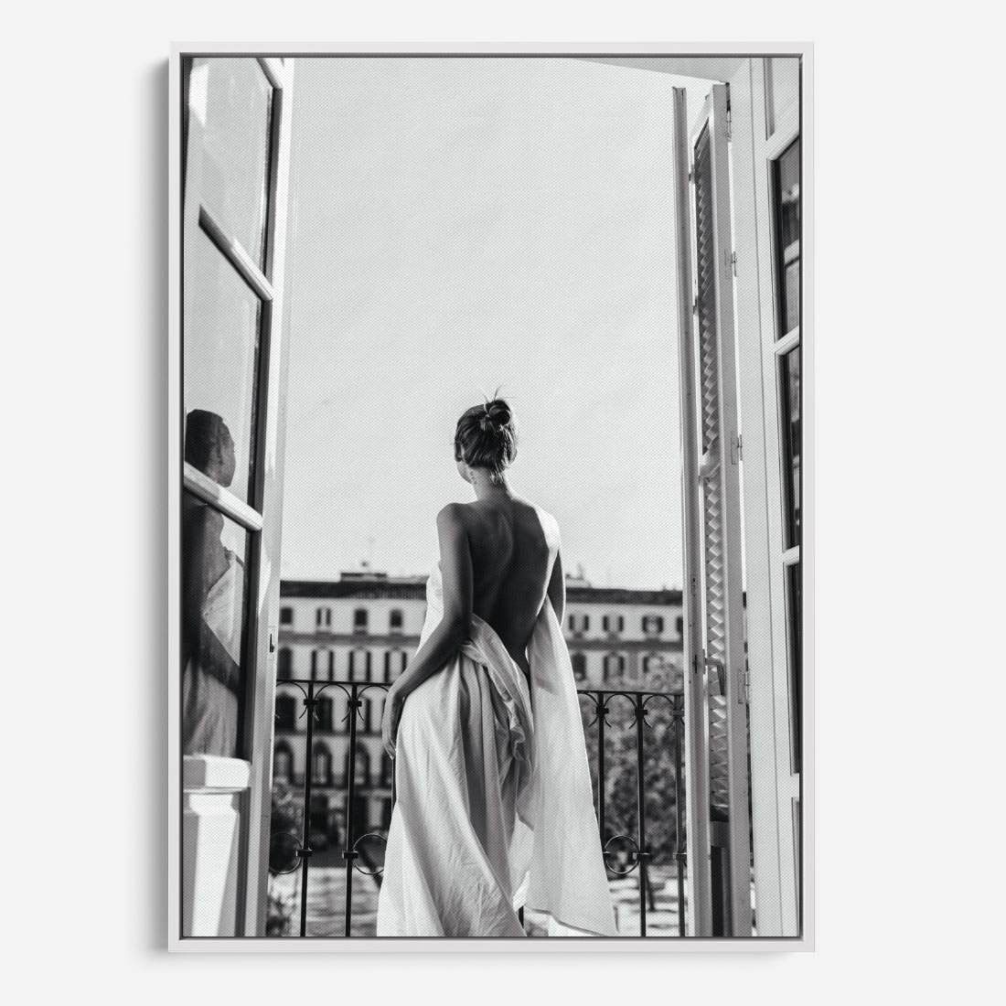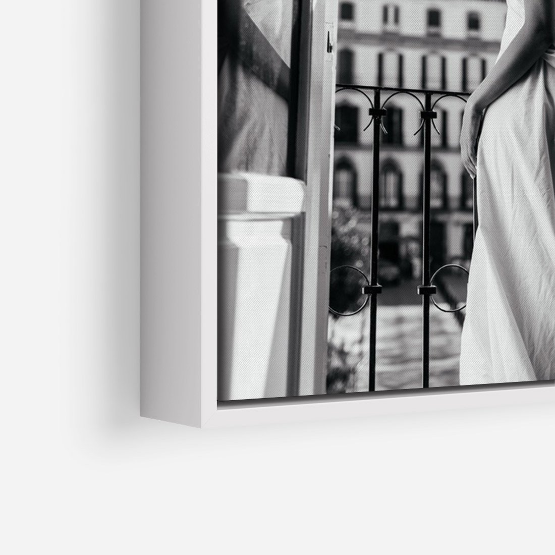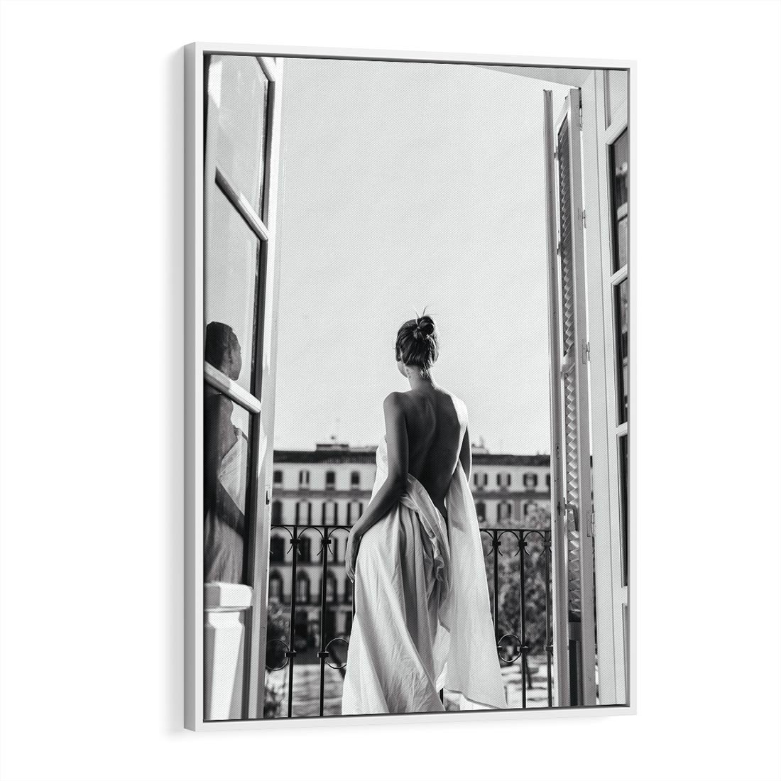 Obraz w ramie 70x100 - Poranki w Paryżu - czarno białe zdjęcie, kobieta w prześcieradle na balkonie - rama biała