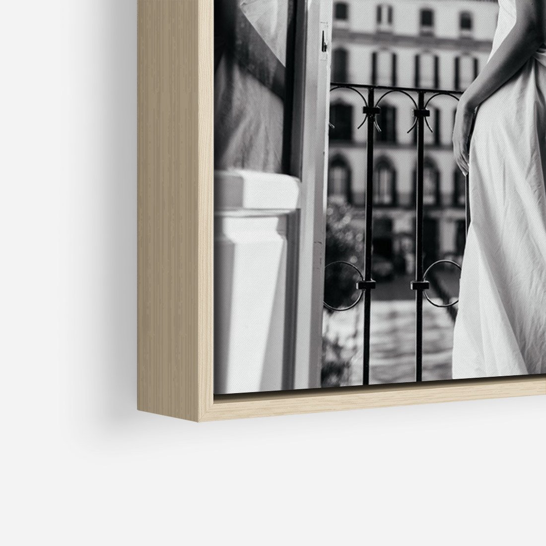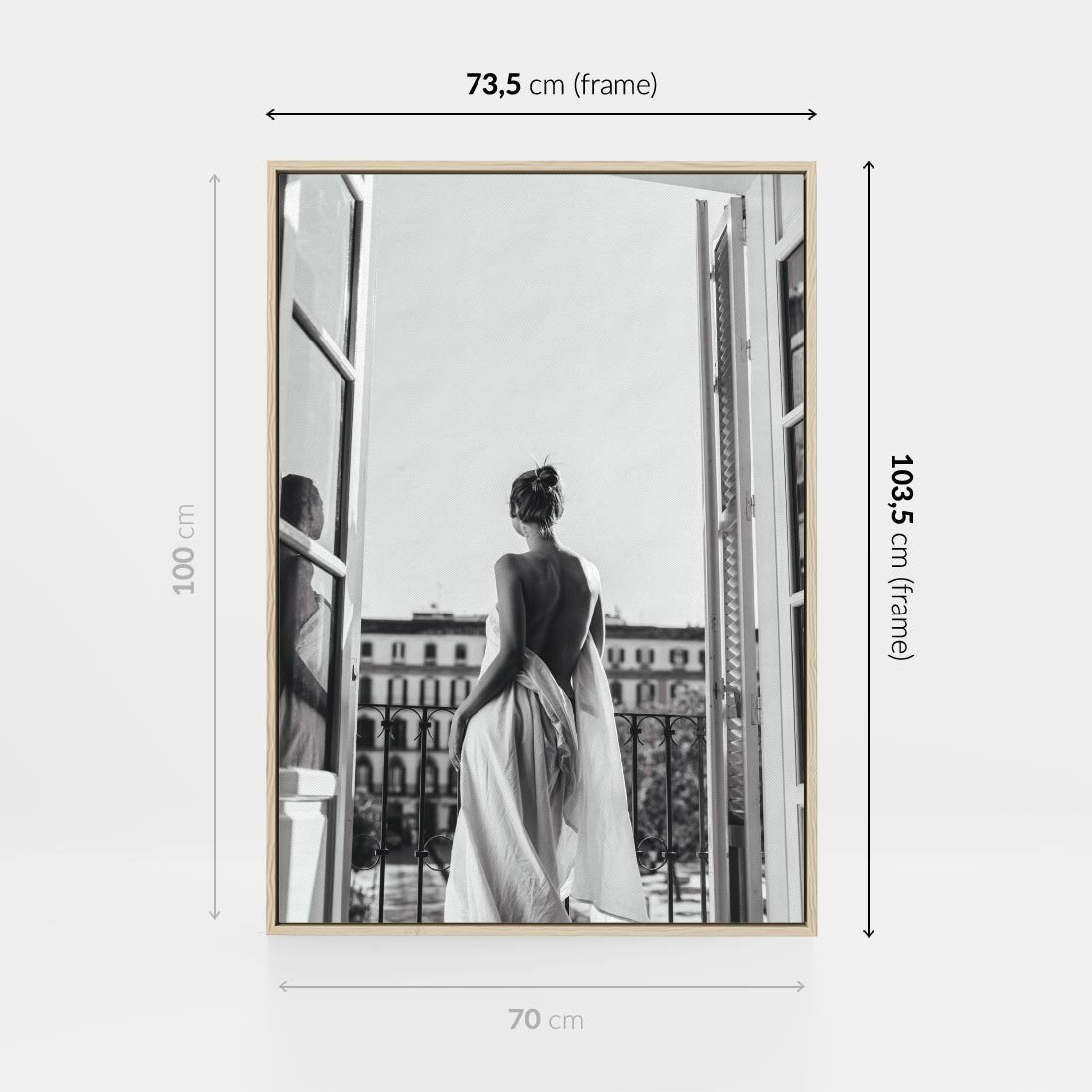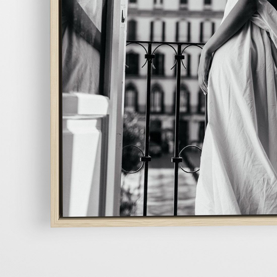 Obraz w ramie 70x100 - Poranki w Paryżu - czarno białe zdjęcie, kobieta w prześcieradle na balkonie - rama drewno