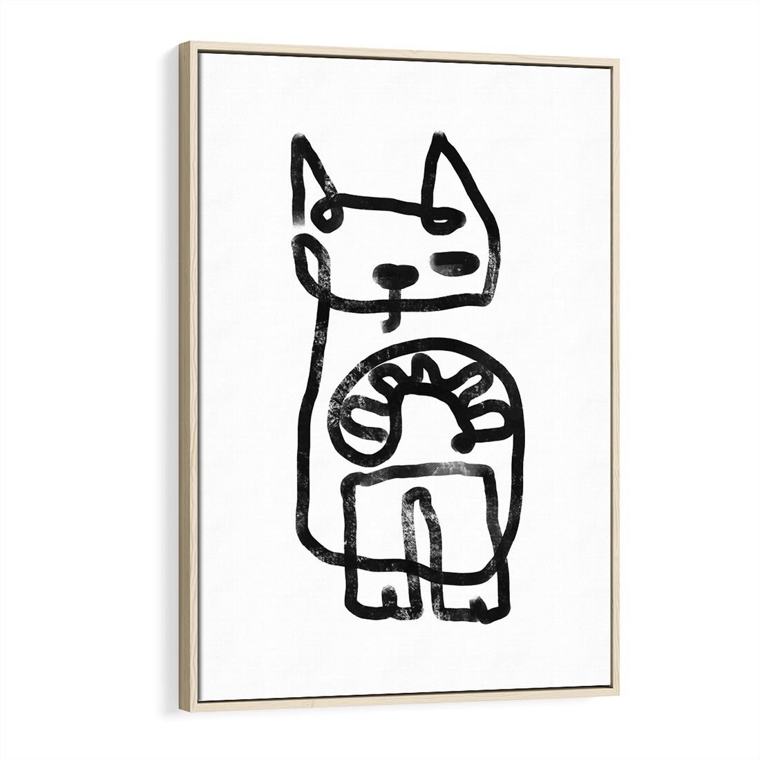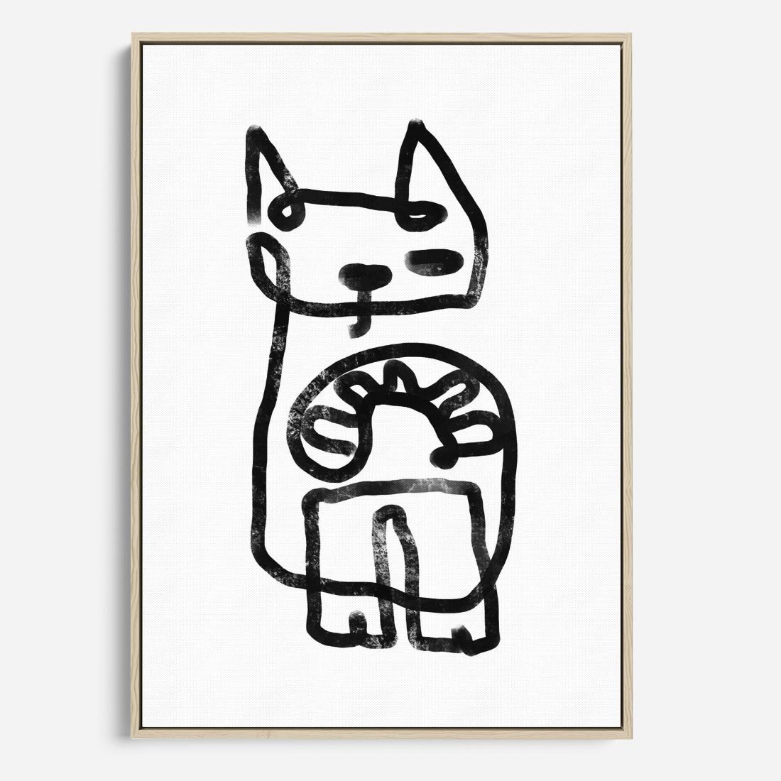 Plakat przedstawiający prymitywny szkic kota na czystym białym tle. Minimalistyczna forma oddaje esencję kociej sylwetki w prosty, ale urokliwy sposób.