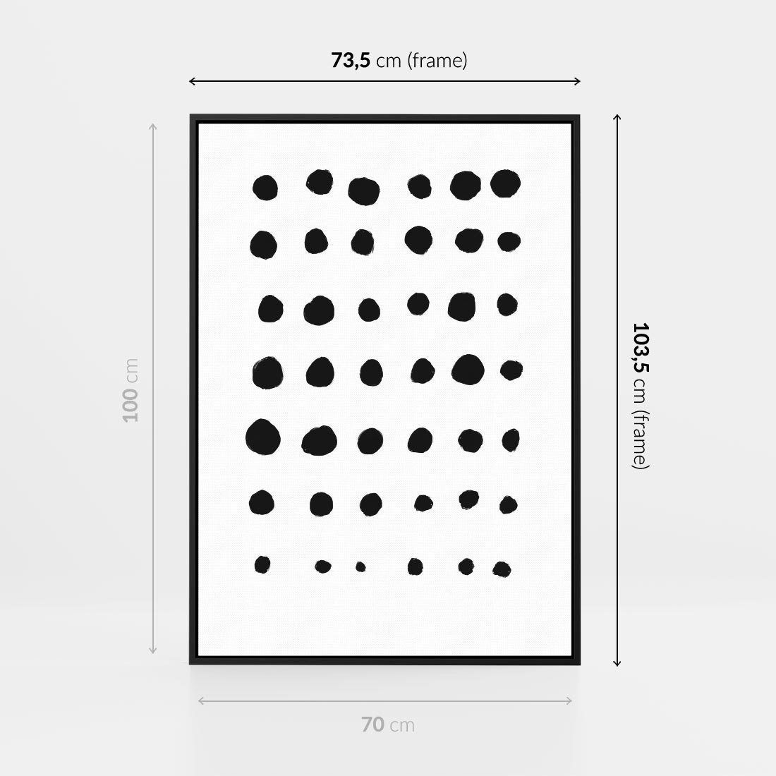 Obraz w ramie 70x100 - Refleksje Światła - minimalistyczna kompozycja, czarne kropkina białym tle - rama czarna
