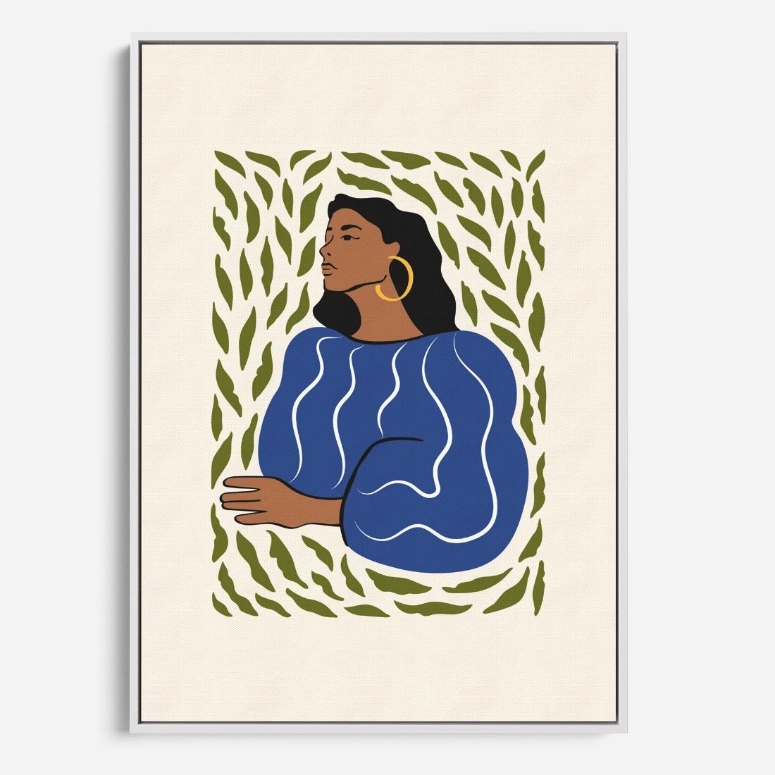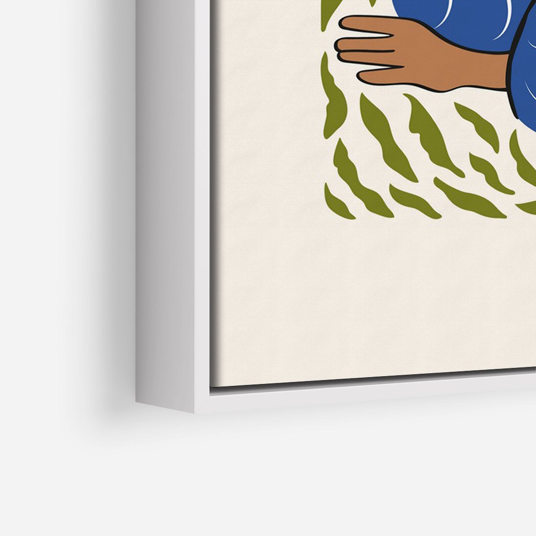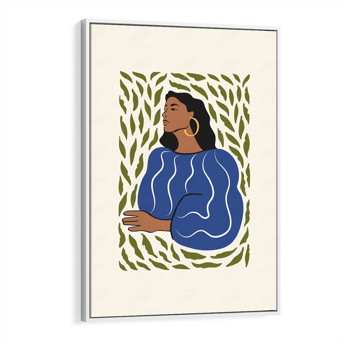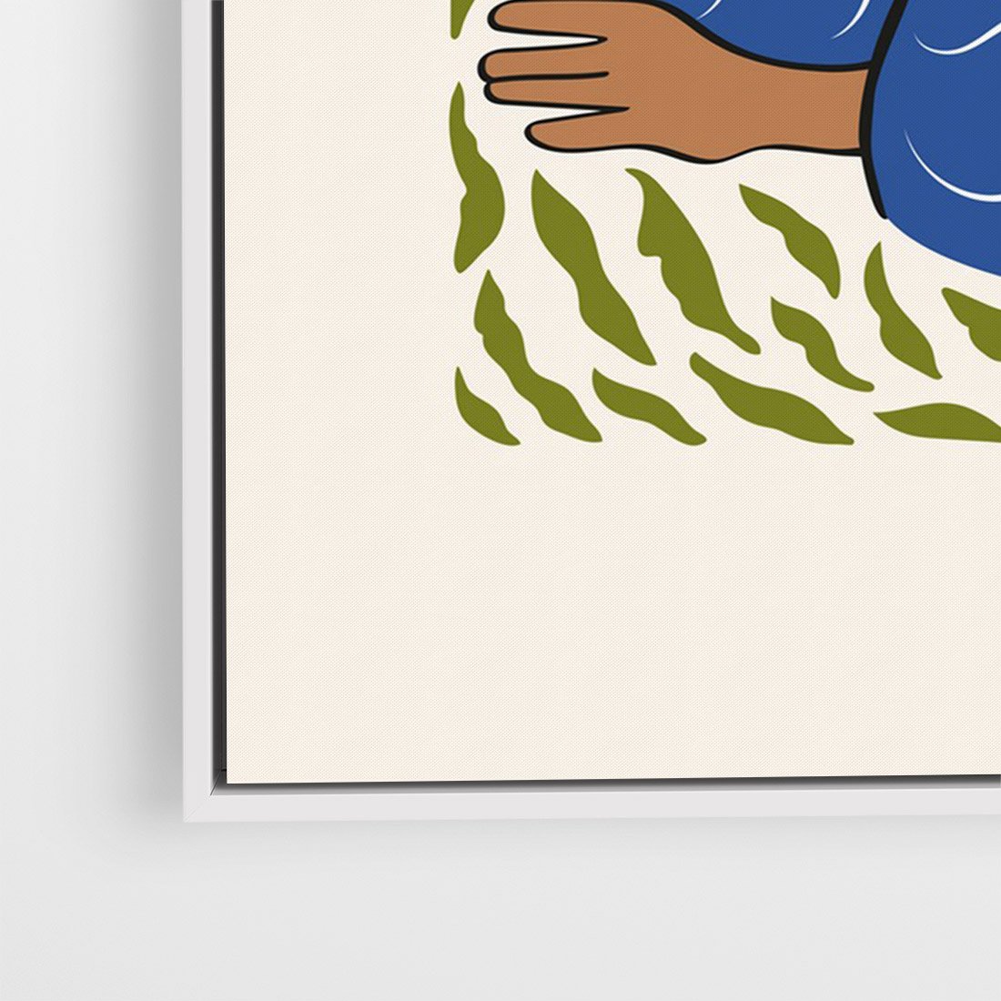 Ten nowoczesny plakat ukazuje minimalistyczną kompozycję kobiety, której otoczenie stanowią delikatne liście. Poprzez wykorzystanie minimalizmu, sztuka ta wyraża spokój i równowagę, tworząc zachęcający obraz, który łączy naturę i nowoczesność w sposób subtelny i elegancki.