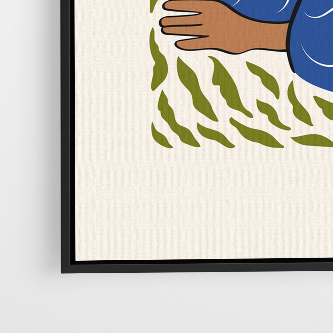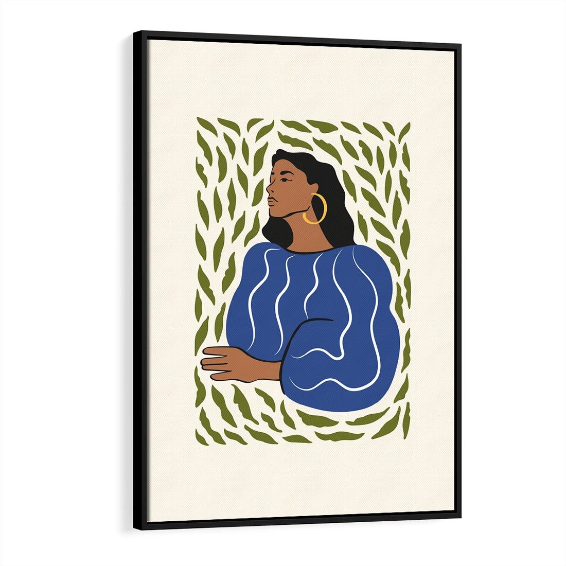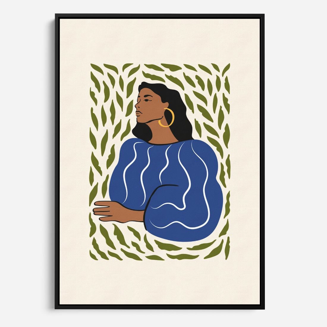 Ten nowoczesny plakat ukazuje minimalistyczną kompozycję kobiety, której otoczenie stanowią delikatne liście. Poprzez wykorzystanie minimalizmu, sztuka ta wyraża spokój i równowagę, tworząc zachęcający obraz, który łączy naturę i nowoczesność w sposób subtelny i elegancki.