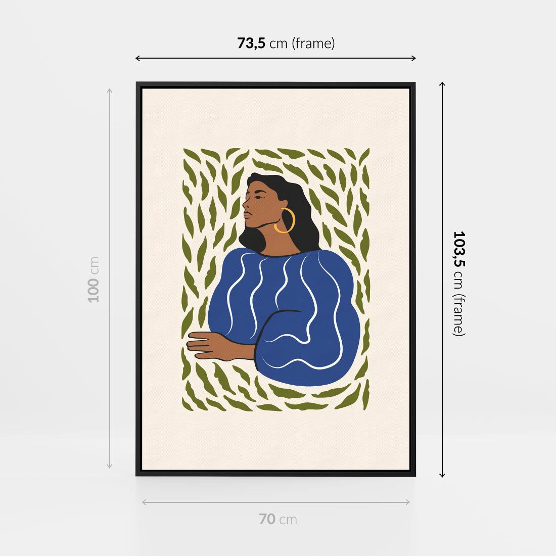 Obraz w ramie 70x100 - Rozbite Barwy - nowoczesny plakat, kobieta otoczona liśćmi - rama czarna