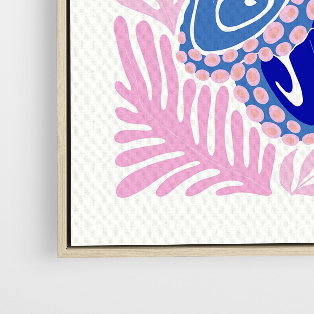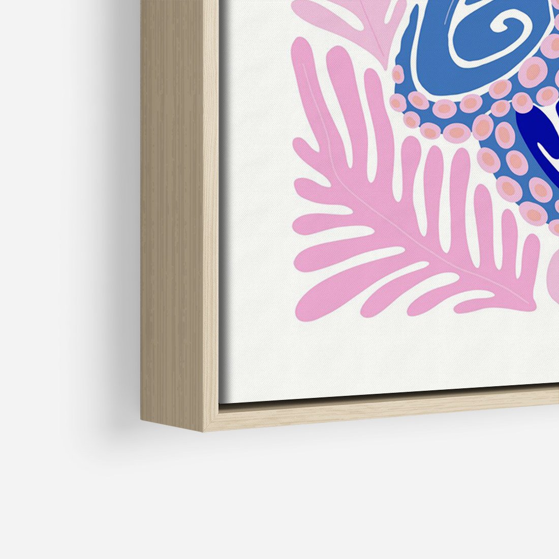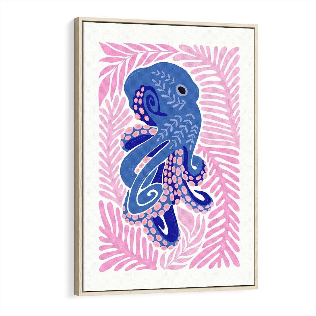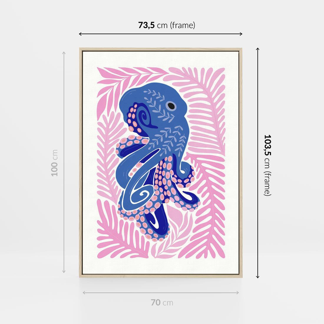 Obraz w ramie 70x100 - Rozkwitające marzenia - abstrakcyjna kompozycja, niebieska ośmiornica wśród różowej roślinnośći - rama drewno