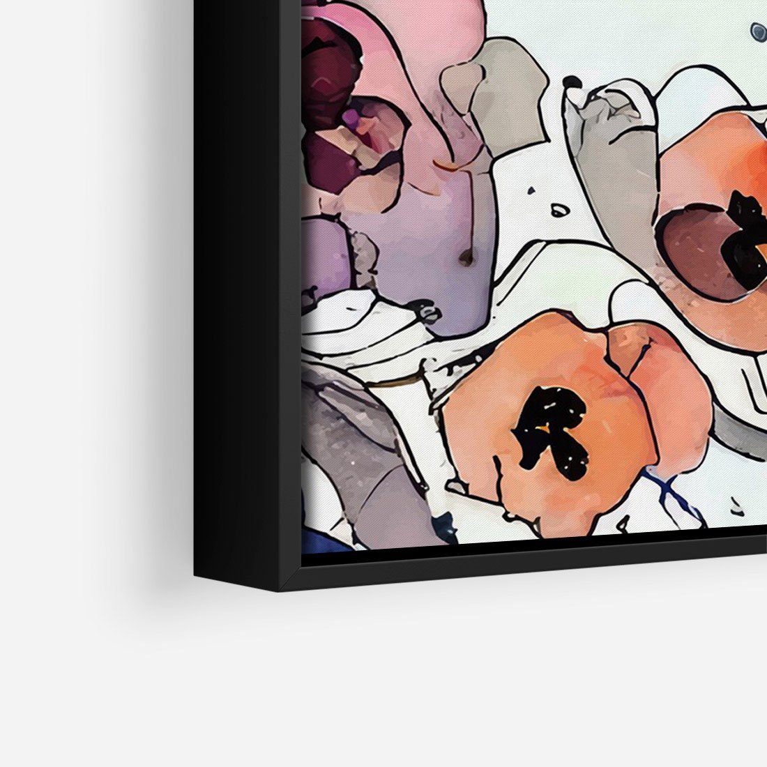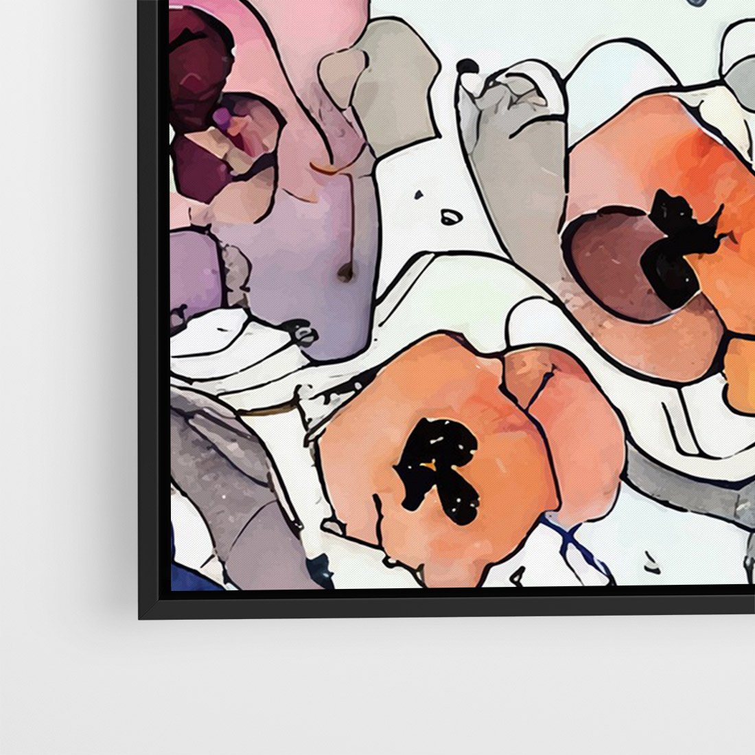 Ten obraz przypomina witrażowe kompozycje, gdzie akwarelowe kwiaty ożywają w intensywnych kolorach. Czarne kontury wydobywają ich piękno i nadają im wyrazistość. To połączenie kunsztu witrażowego z subtelnością kwiatowych motywów tworzy niepowtarzalną wizję natury.