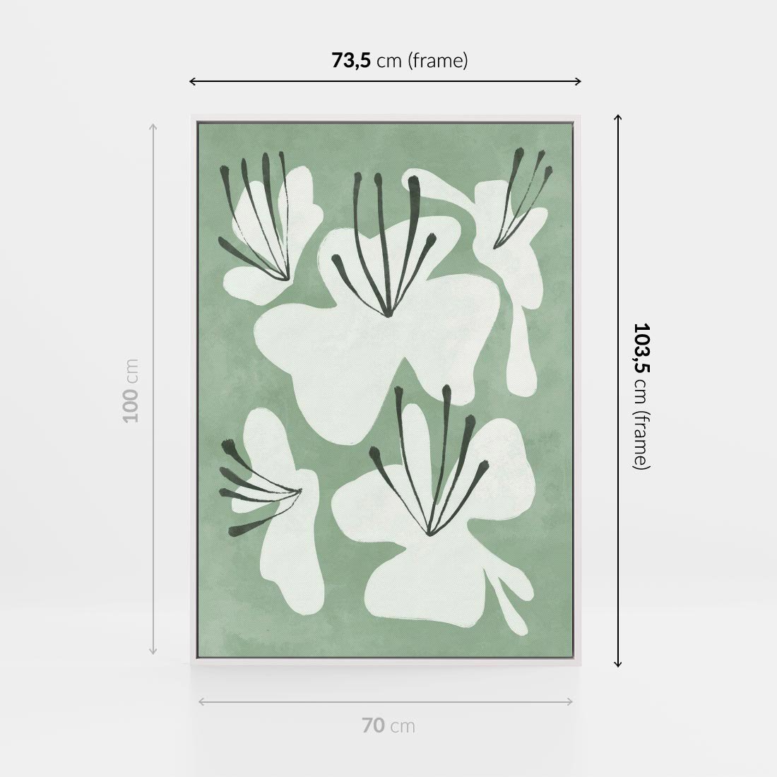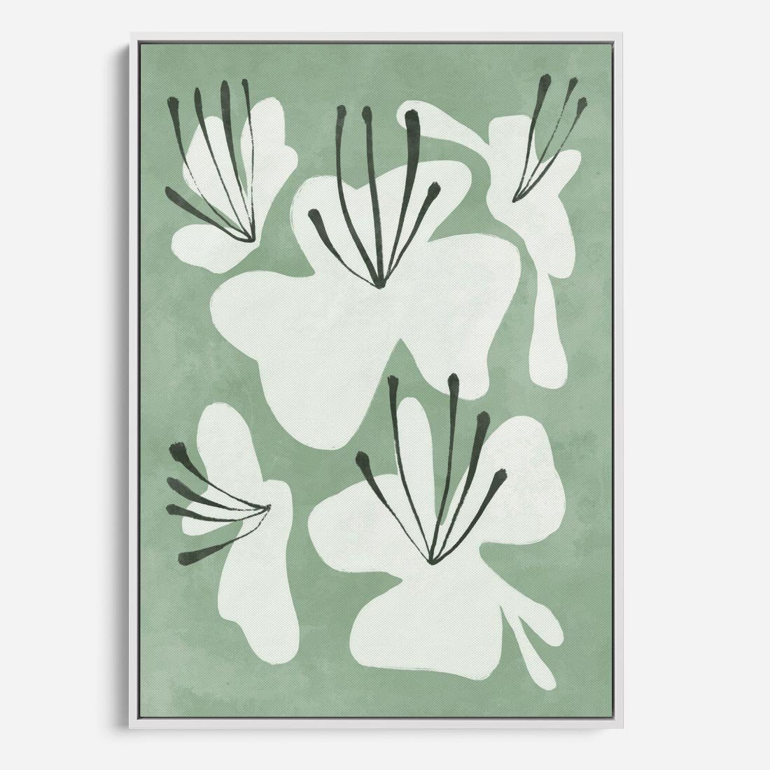 Zgaszona zieleń tworzy tło dla delikatnych kwiatów na tym minimalistycznym plakacie. Ta subtelna kompozycja dodaje elegancji i spokoju do przestrzeni, idealnie wpisując się w nowoczesne wnętrza.