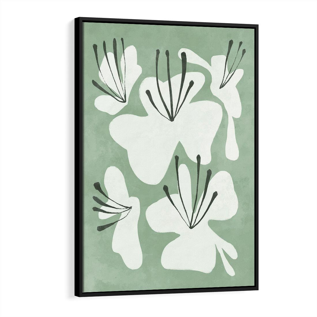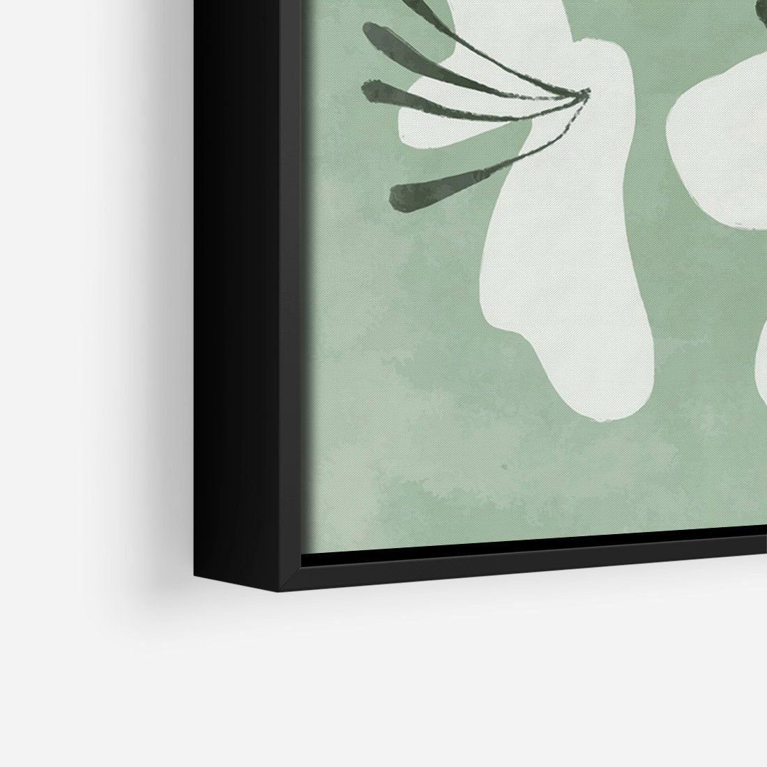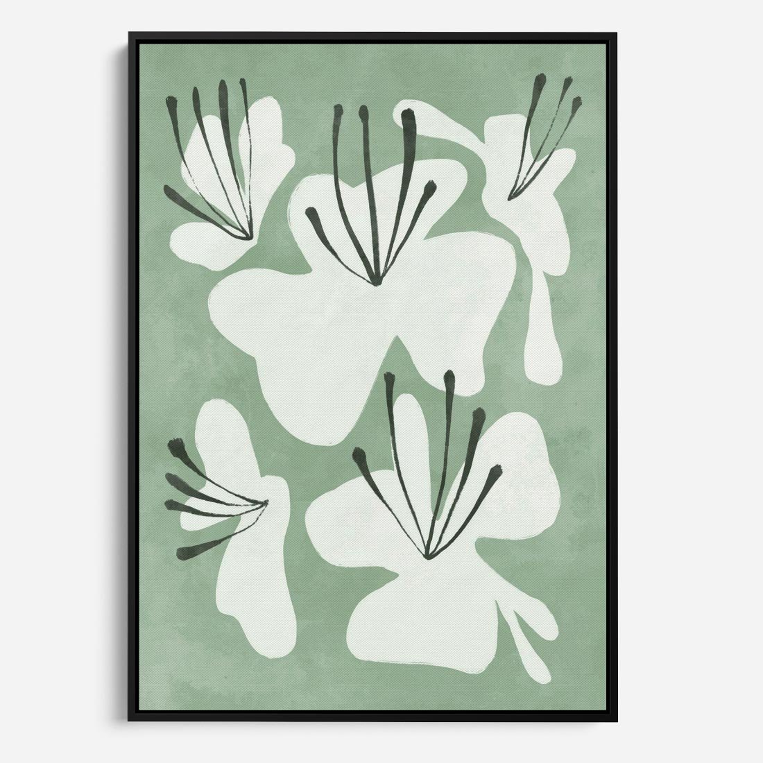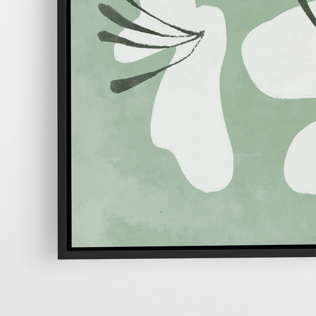 Zgaszona zieleń tworzy tło dla delikatnych kwiatów na tym minimalistycznym plakacie. Ta subtelna kompozycja dodaje elegancji i spokoju do przestrzeni, idealnie wpisując się w nowoczesne wnętrza.