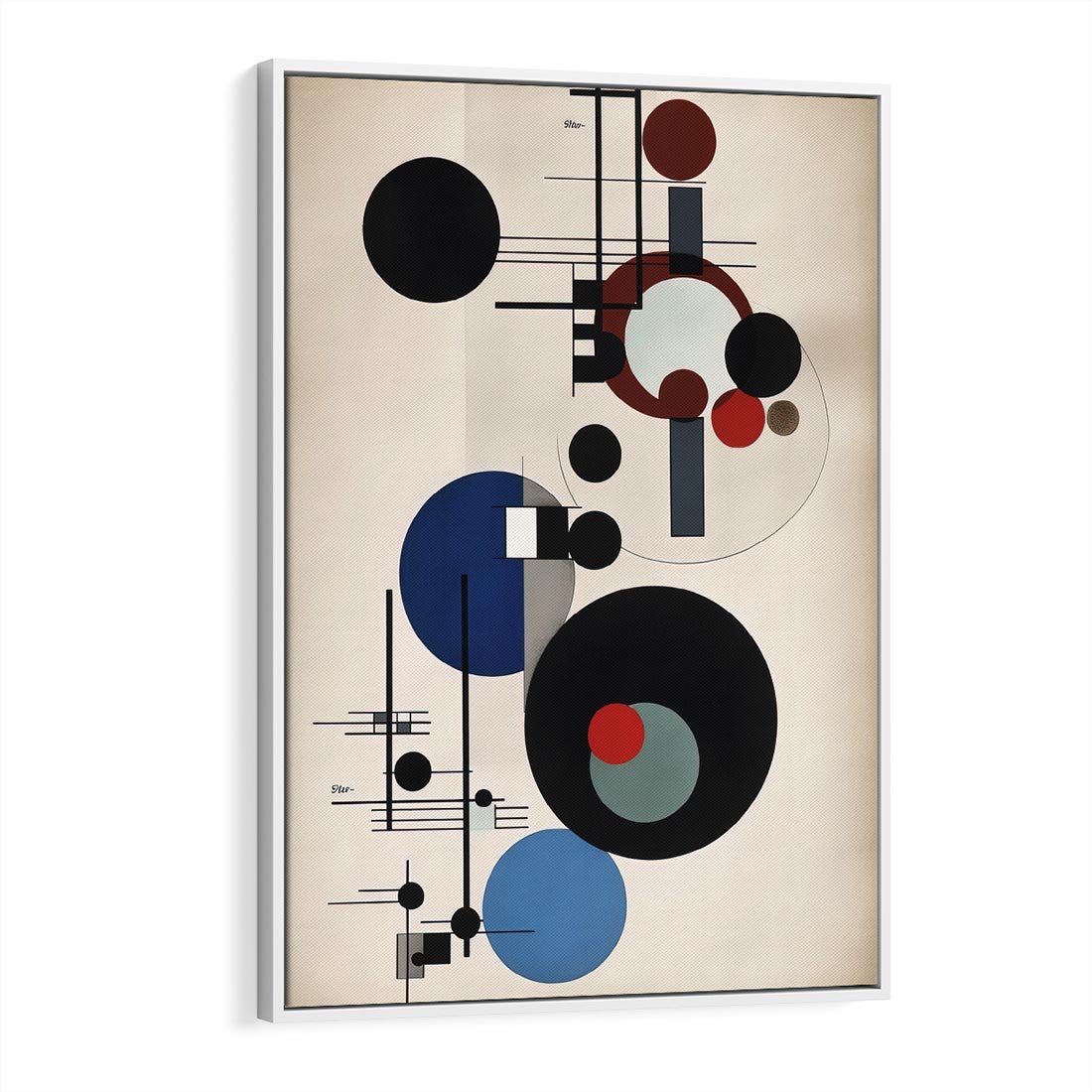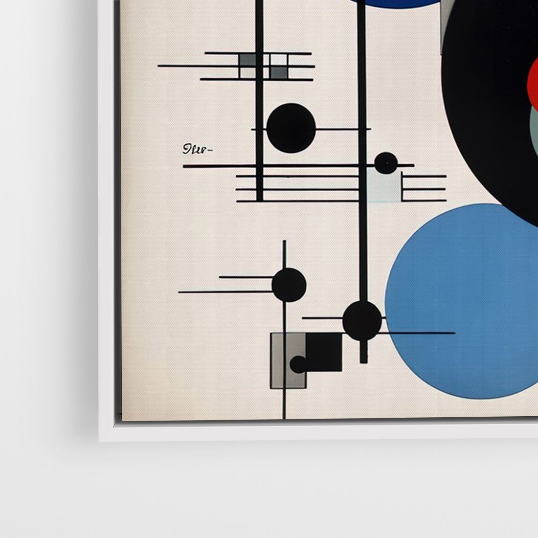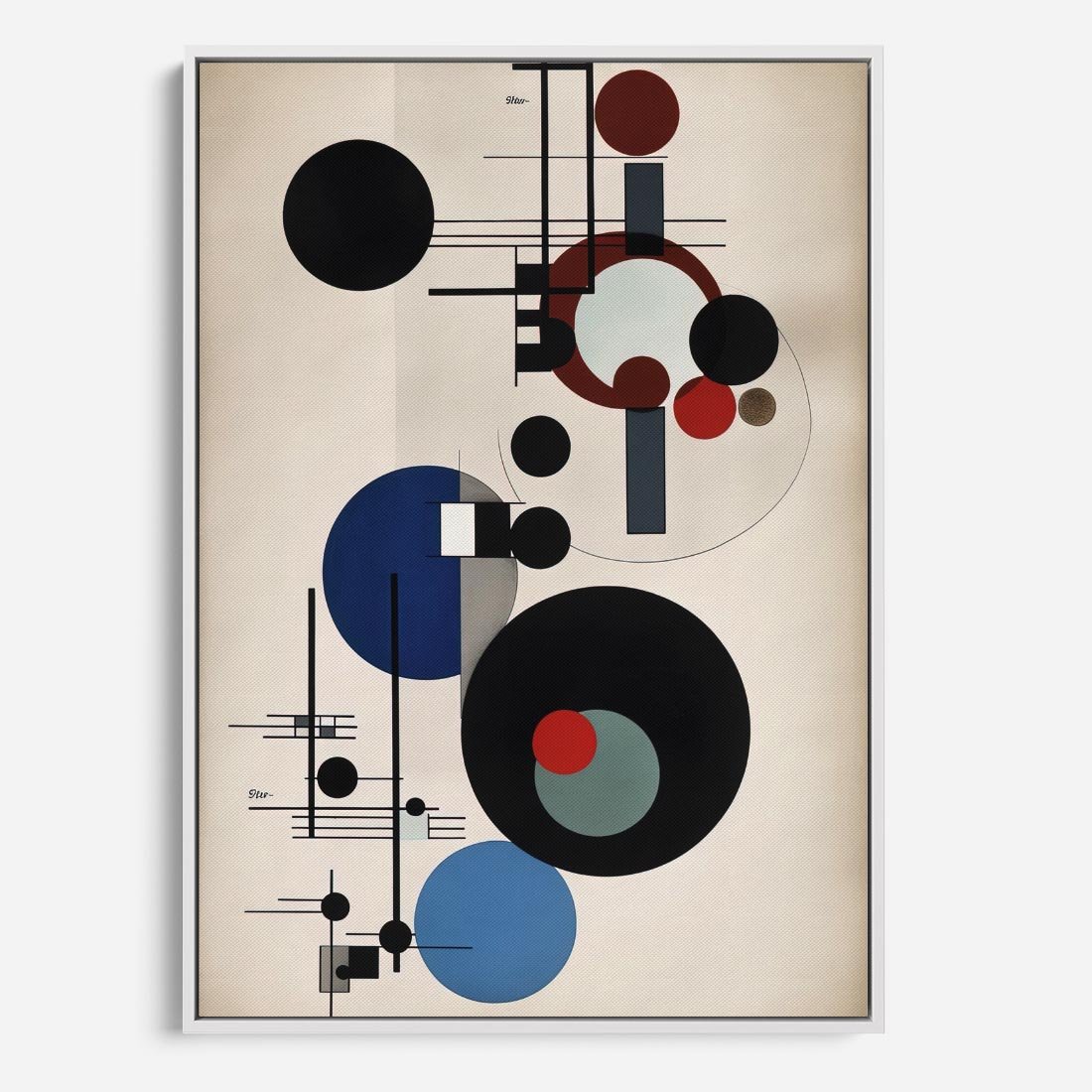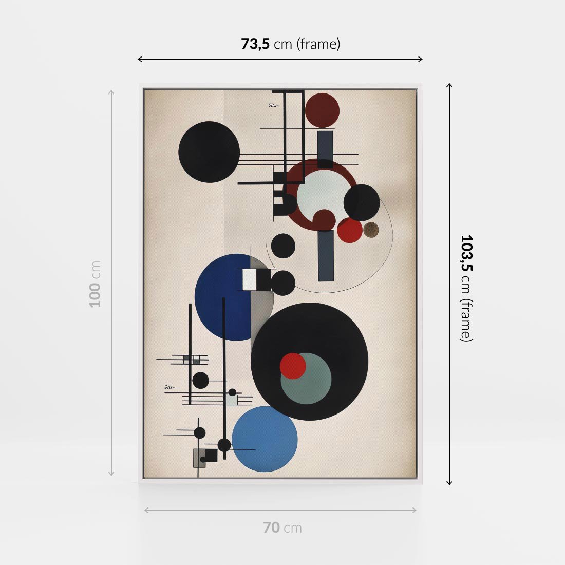 Ta abstrakcyjna geometryczna kompozycja inspirowana stylem Wassily'ego Kandinsky'ego połącza dynamiczne koła i linie w harmonijną całość. Zaskakujące połączenia kształtów tworzą fascynującą podróż wzrokową, podobnie jak w dziełach mistrza abstrakcji. To wyjątkowe dzieło sztuki emanuje energią i pasją, oddając hołd twórczości Kandinsky'ego w nowoczesnym kontekście.