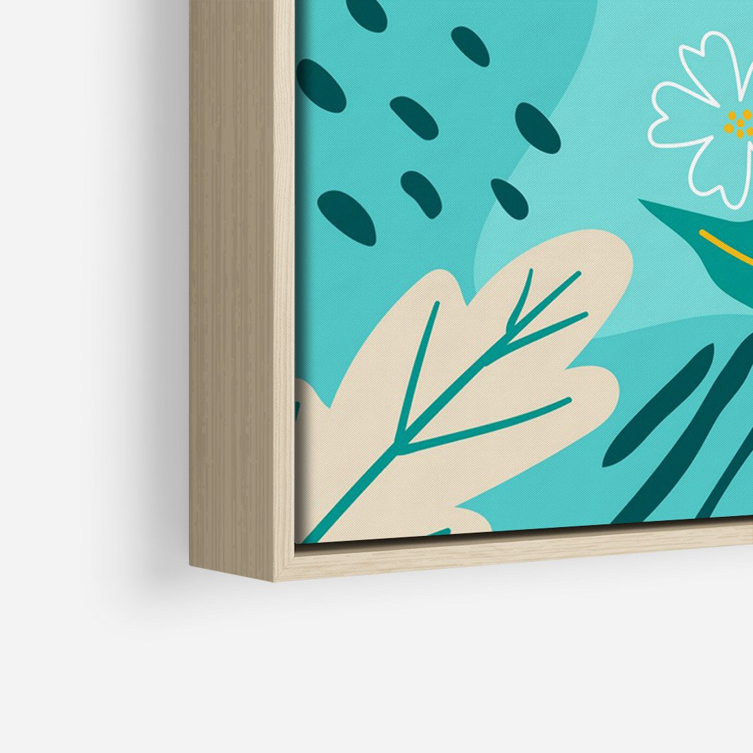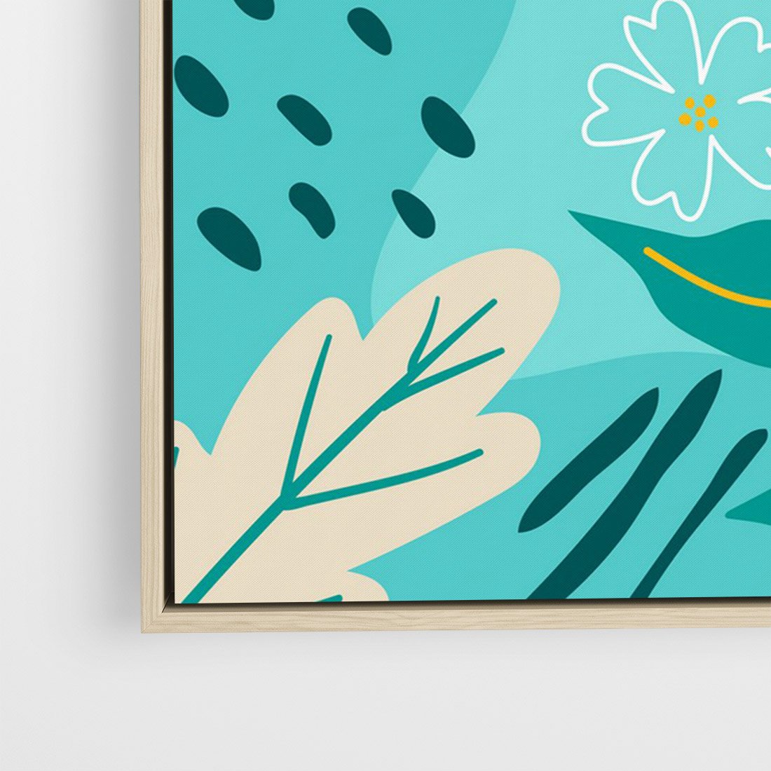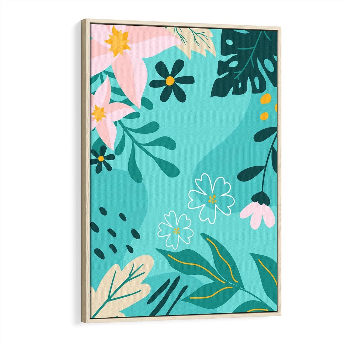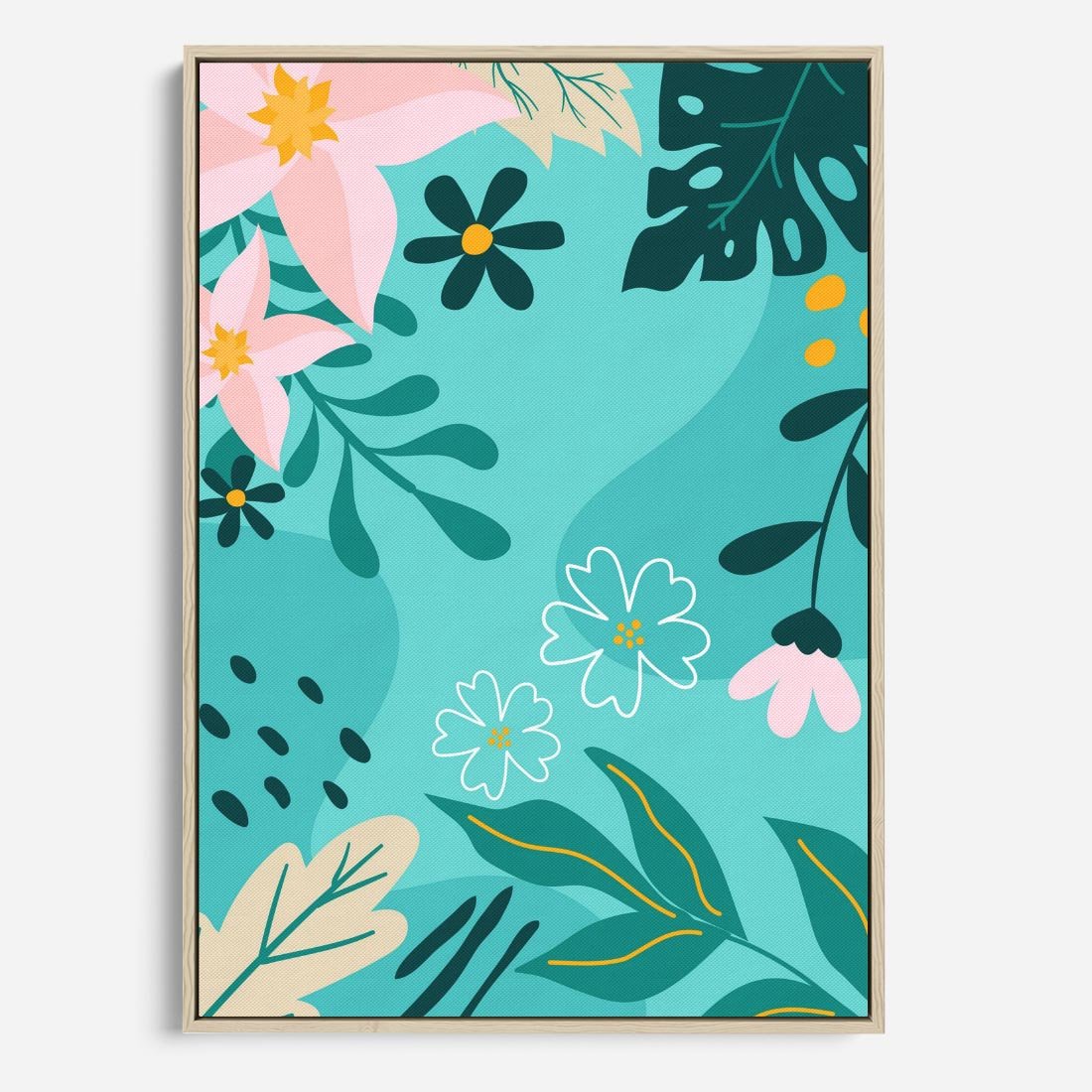 Pastelowa kompozycja ożywiona tropikalnymi kwiatami i liśćmi. Delikatne odcienie turkusu i różu tworzą wizualne radosne piękno, przywołując atmosferę egzotycznej harmonii.