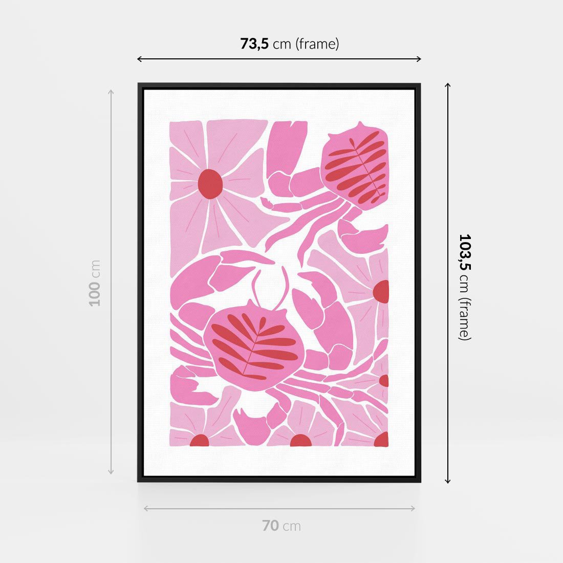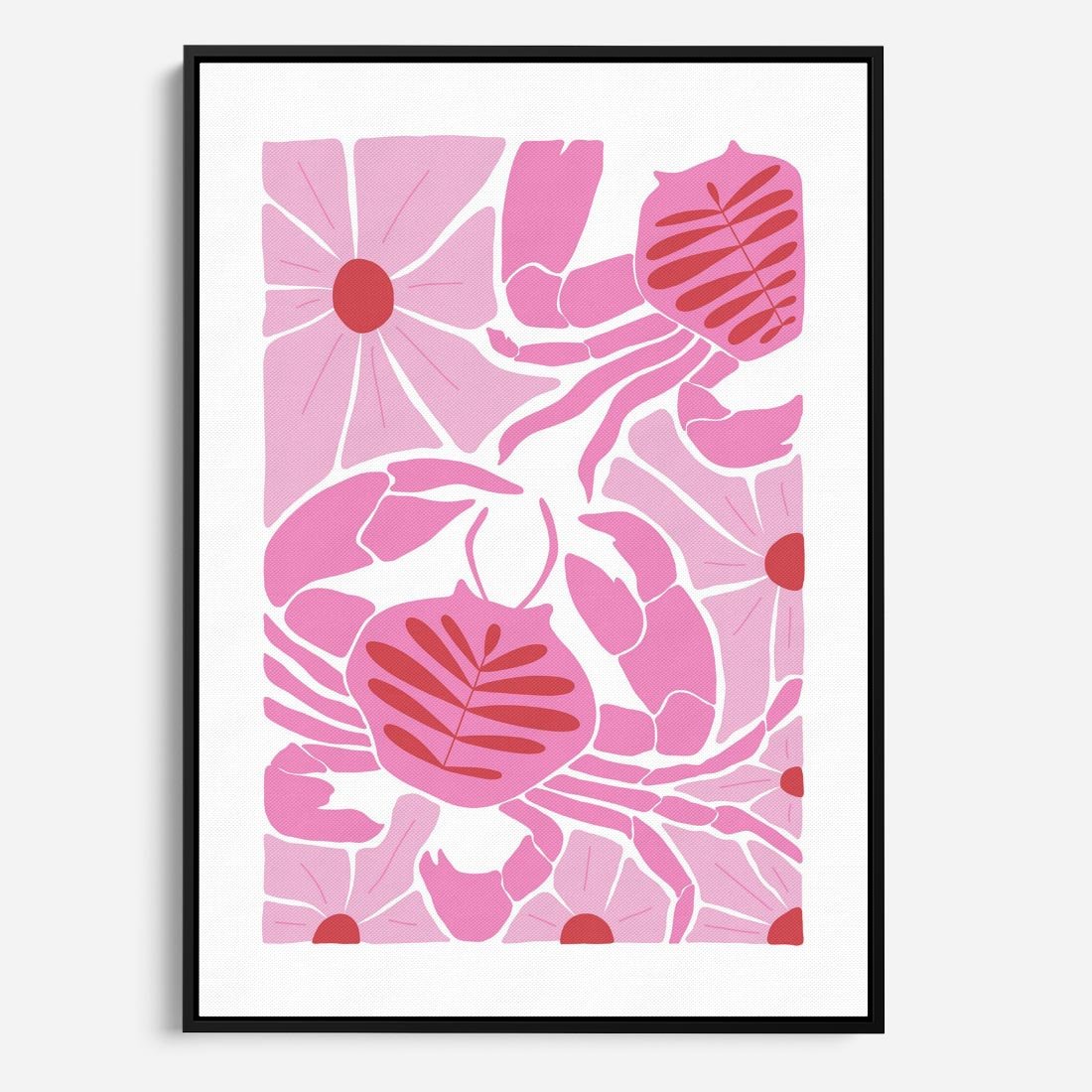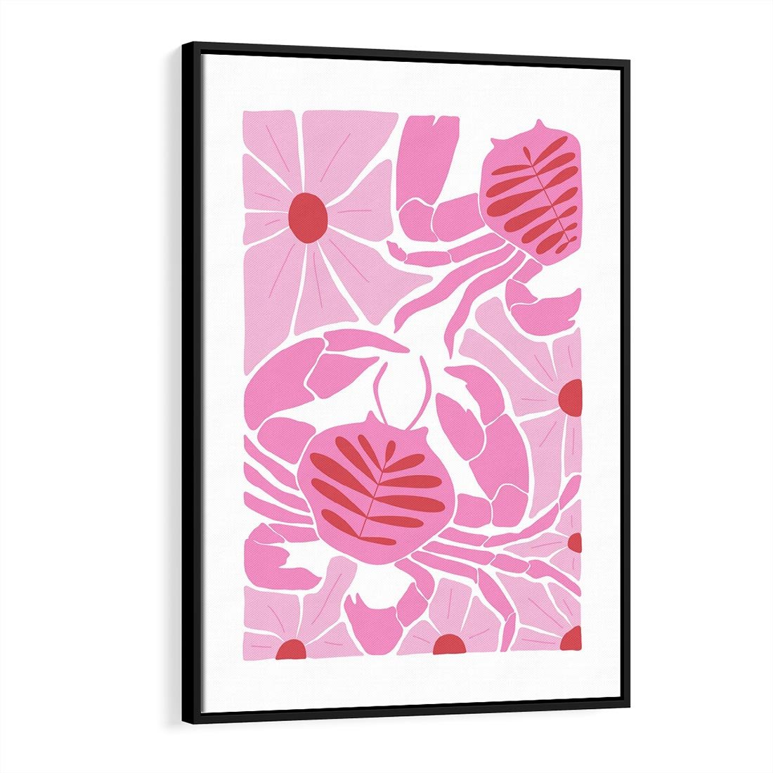 Obraz w ramie 70x100 - Roztańczone Kraby - różowe kwiaty i kraby, abstrakcyjna kompozycja - rama czarna