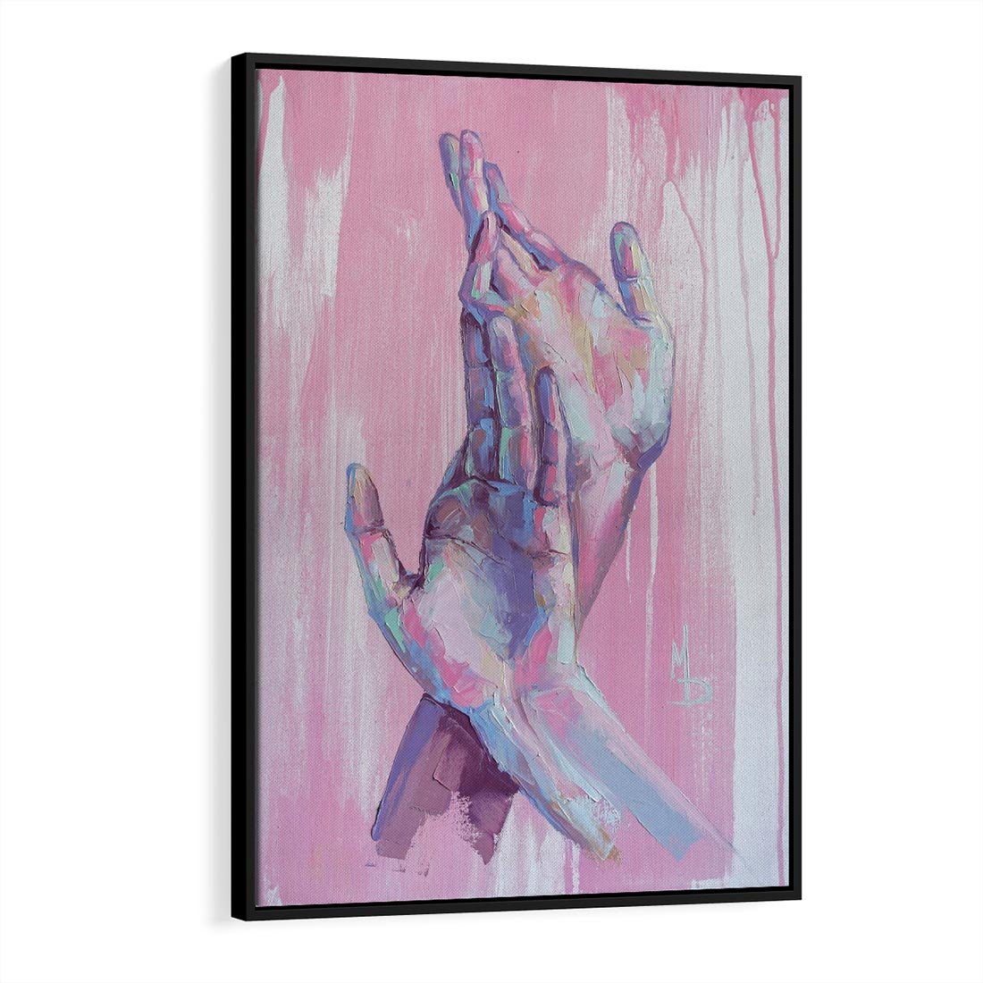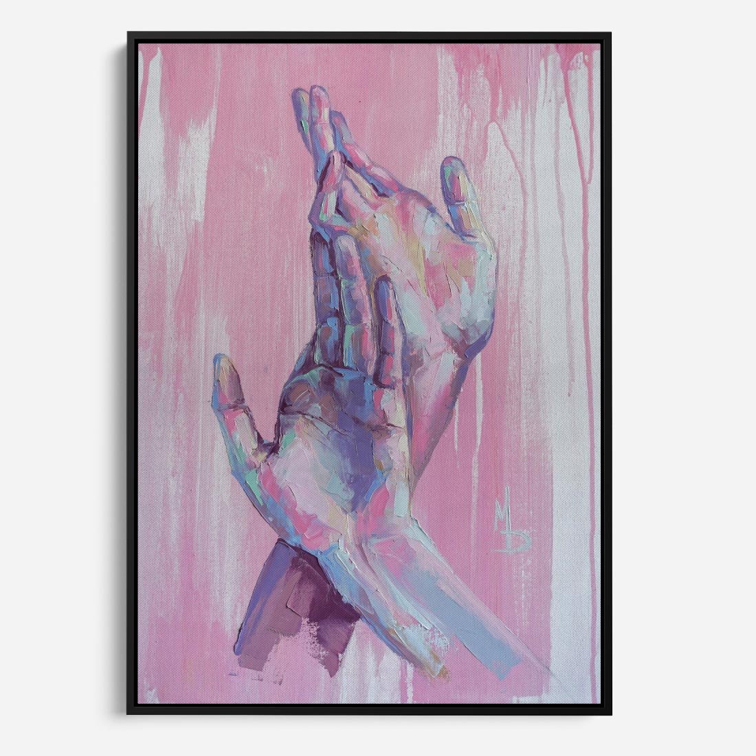 Ten nowoczesny obraz olejny w pastelowych kolorach prezentuje splecione dłonie jako główny motyw. Delikatne odcienie pasteli nadają mu subtelności i spokoju, tworząc jednocześnie abstrakcyjną i znaczącą kompozycję. To dzieło sztuki emanuje harmonią i jednością, symbolizującą współpracę, miłość lub zrozumienie między ludźmi. Idealnie pasuje do wnętrz o nowoczesnym designie, które cenią sobie sztukę jako wyraz emocji i relacji.