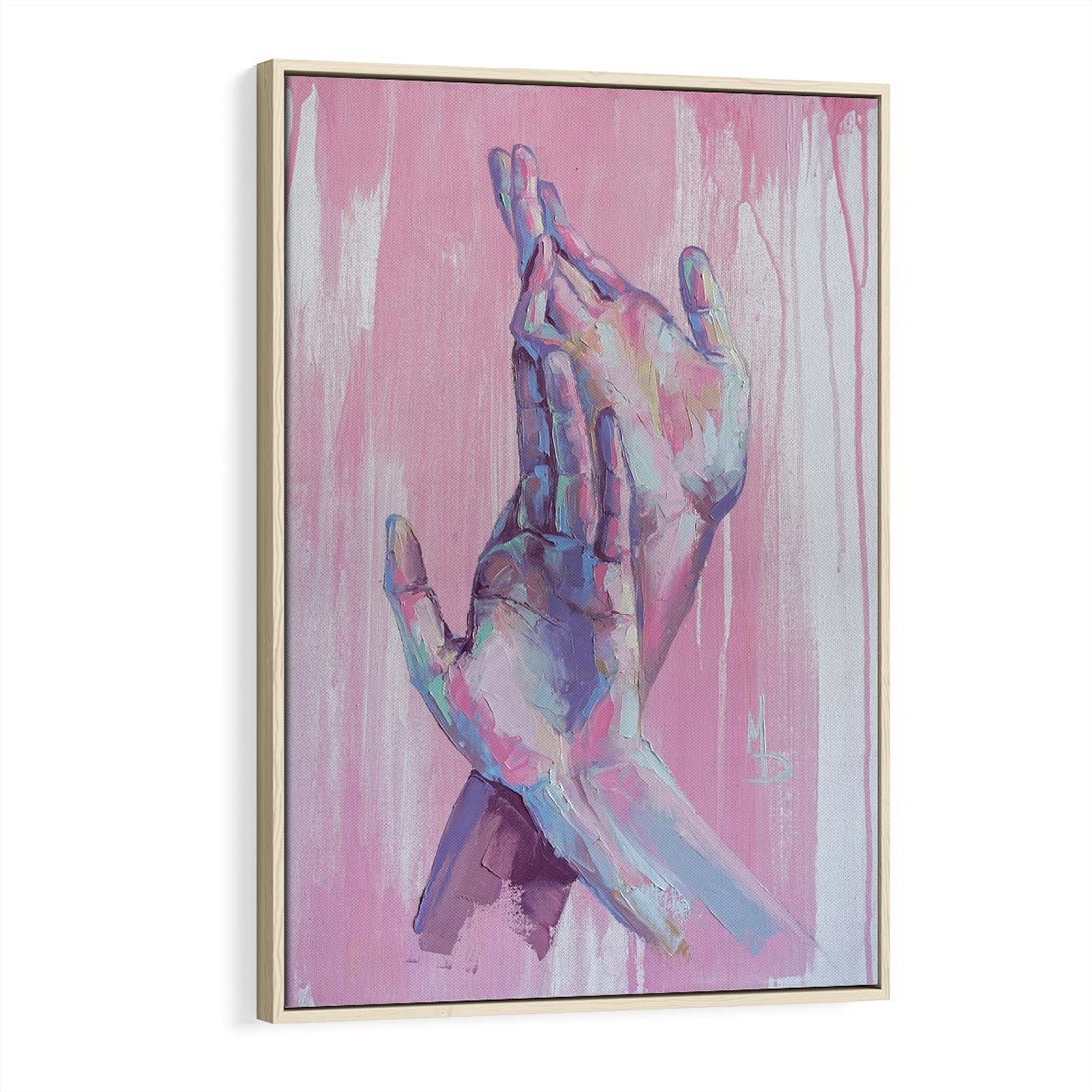 Ten nowoczesny obraz olejny w pastelowych kolorach prezentuje splecione dłonie jako główny motyw. Delikatne odcienie pasteli nadają mu subtelności i spokoju, tworząc jednocześnie abstrakcyjną i znaczącą kompozycję. To dzieło sztuki emanuje harmonią i jednością, symbolizującą współpracę, miłość lub zrozumienie między ludźmi. Idealnie pasuje do wnętrz o nowoczesnym designie, które cenią sobie sztukę jako wyraz emocji i relacji.