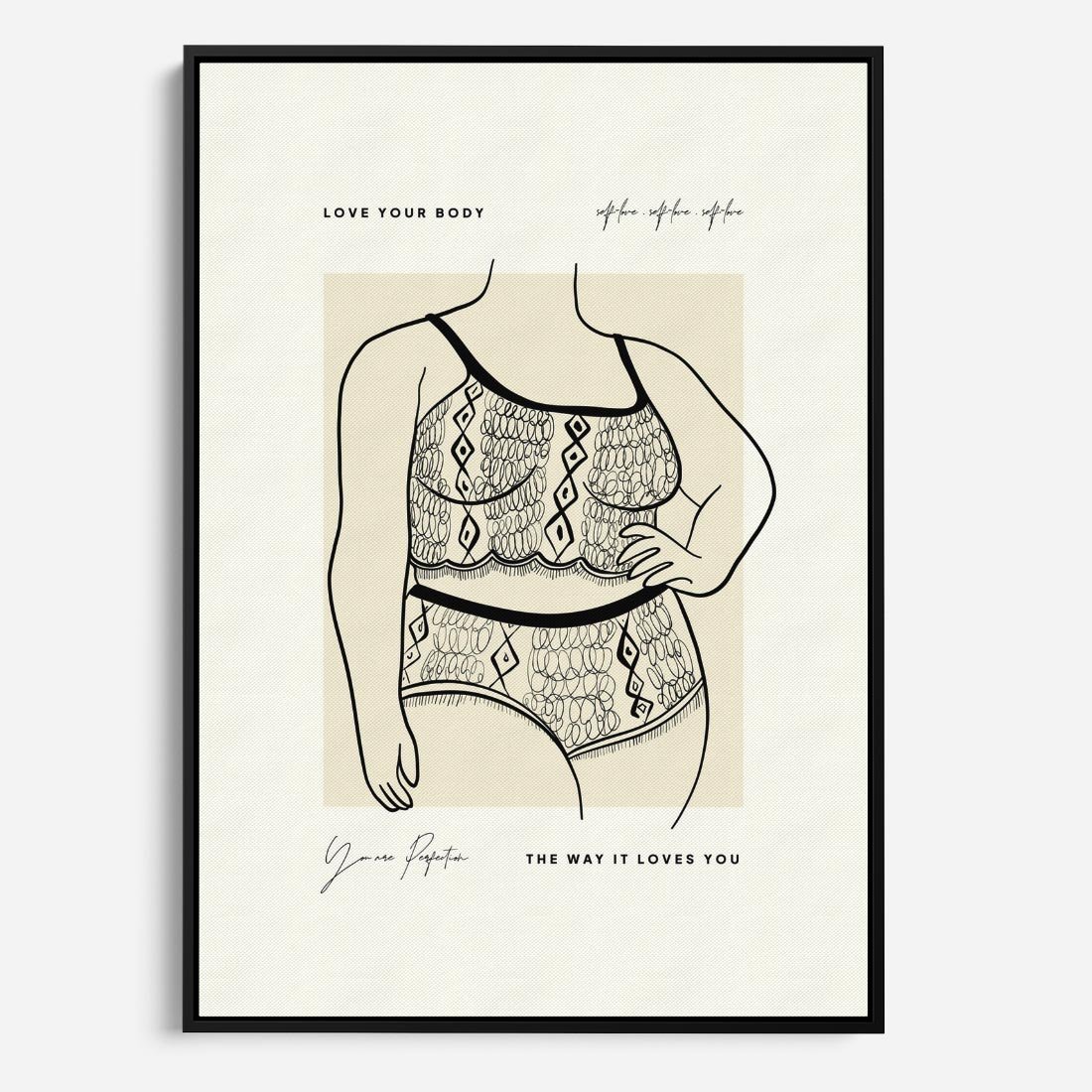 Ten plakat to hołd dla kobiecej siły i piękna. Delikatny rysunek kobiety w bieliźnie, wzbogacony subtelnie dobraną typografią, tworzy wyjątkową kompozycję, oddającą piękno i pewność siebie.