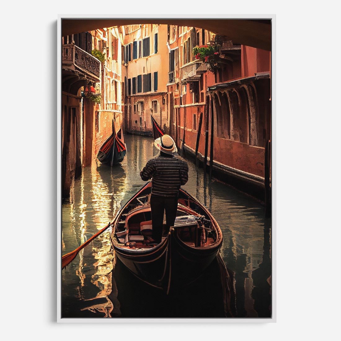 Obraz w ramie 70x100 - Spokojna Wenecja - gondolier w gondoli, kanały Wenecji - rama biała