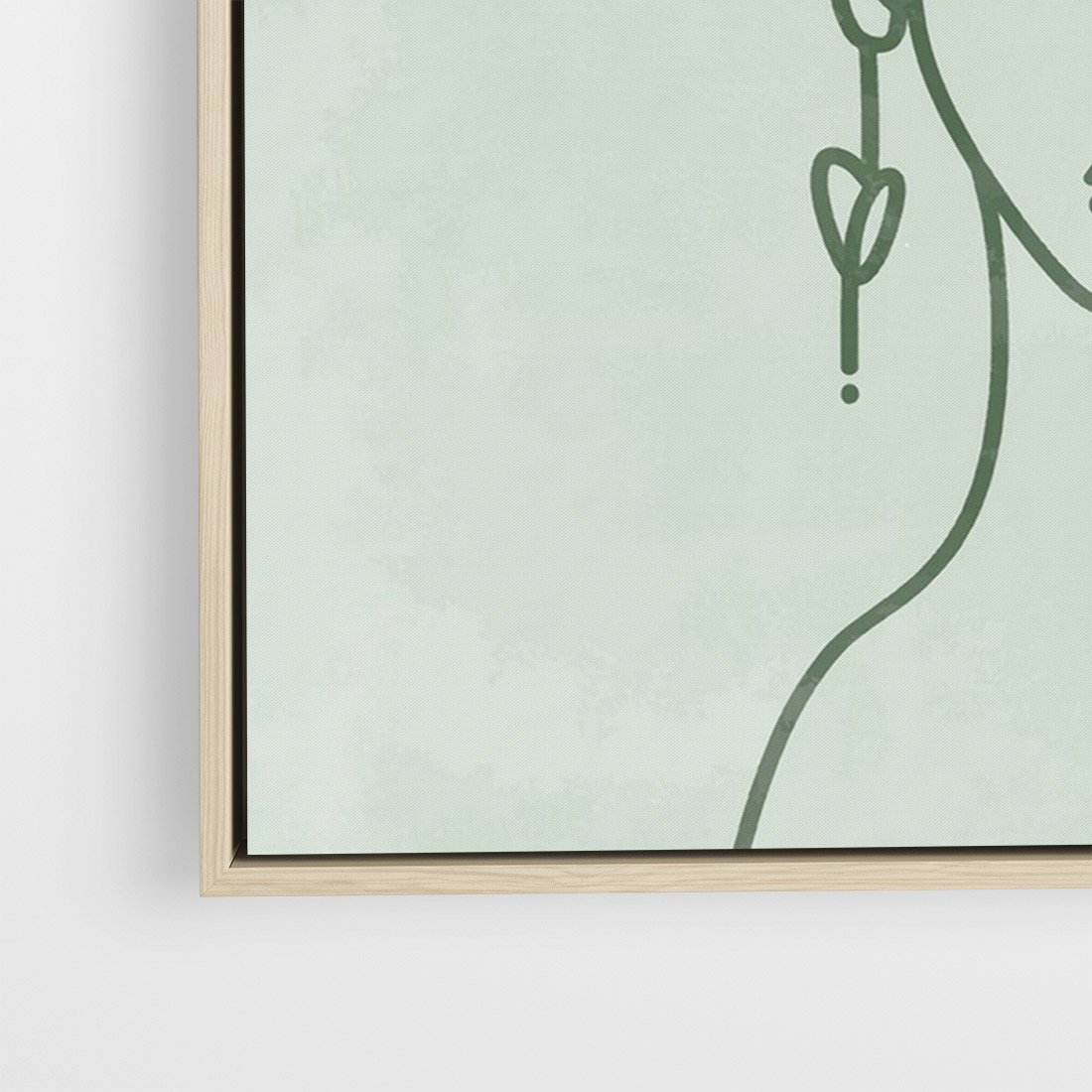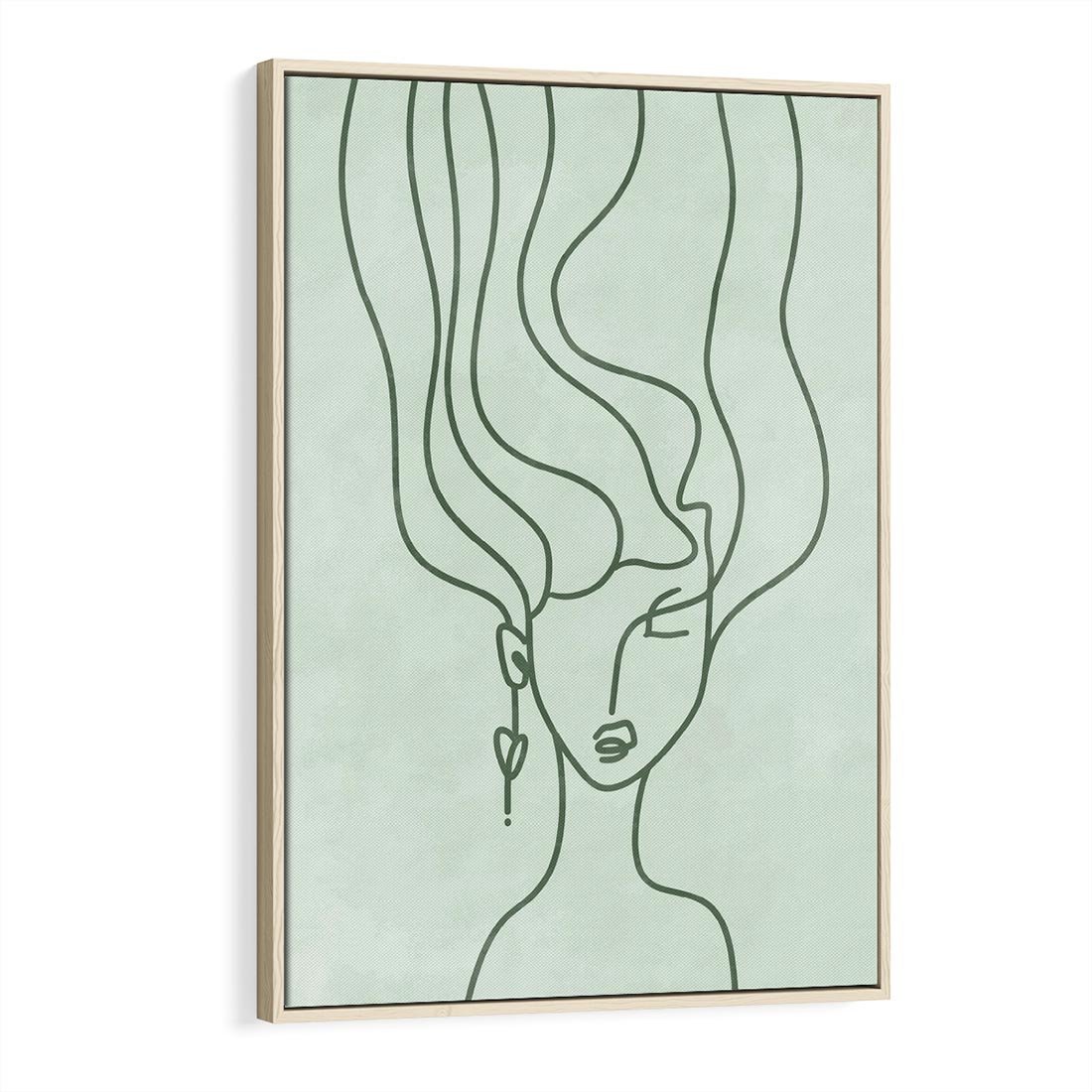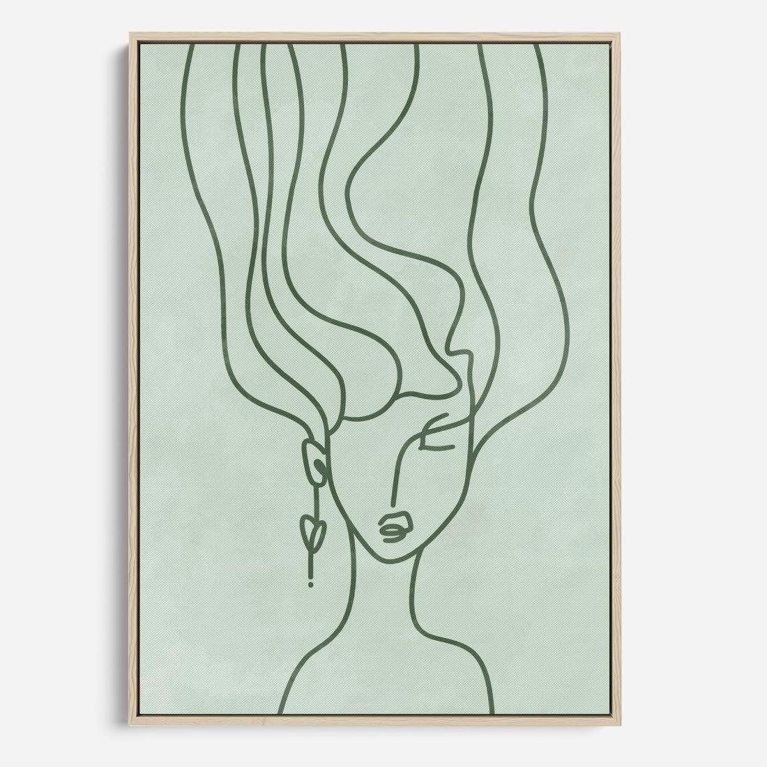Abstrakcyjny zielony szkic ukazujący kobietę z długimi włosami tworzy wyjątkowy wizualny efekt. Delikatność zielonych linii nadaje kompozycji harmonii, a jednocześnie zachowuje abstrakcyjny charakter, co może ciekawie uzupełnić różne rodzaje wnętrz.