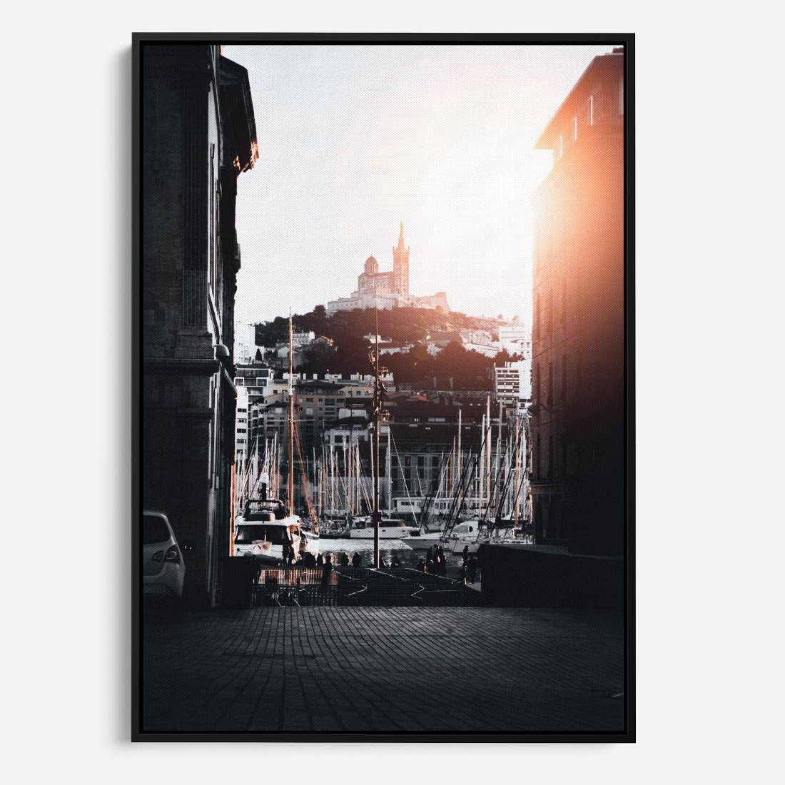 Obraz w ramie 70x100 - Światło Portowe - czarno białe zdjecie, uliczka w nadmorskim mieście - rama czarna