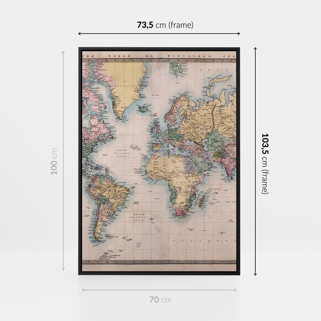 Obraz w ramie 70x100 - Światło Przeszłości - retro mapa świata, mapa - rama czarna