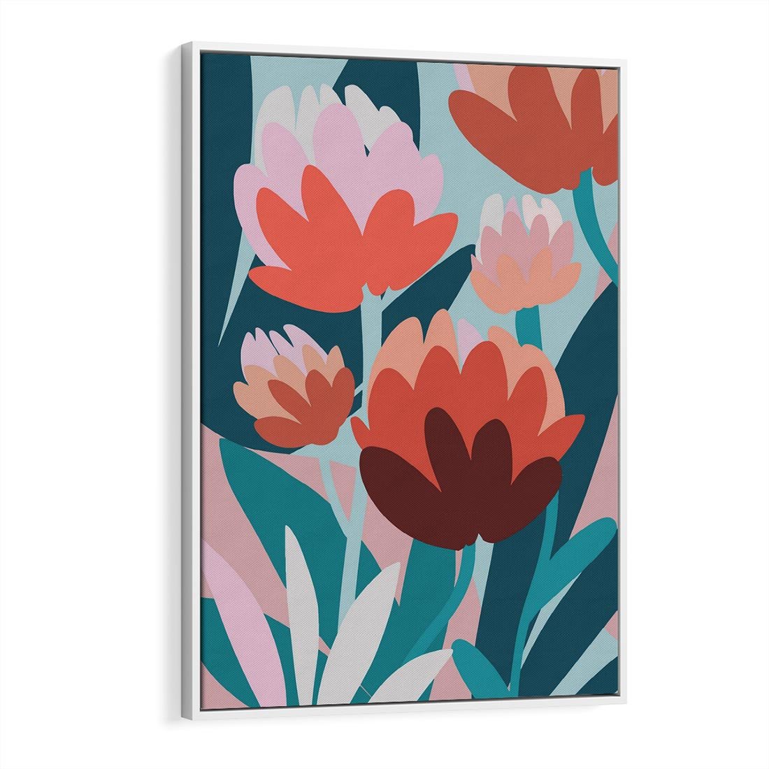 Obraz w ramie 70x100 - Symfonia Kwiatów - abstrakcyjna kompozycja kwiatowych form, kolor zgaszone - rama biała