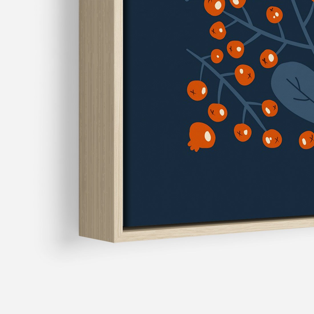 Na granatowym tle wyraziste pomarańczowe owoce jarzębiny tworzą dynamiczną roślinną kompozycję. To harmonijne połączenie barw, które oddaje piękno i zróżnicowanie natury. To obraz, który przykuwa uwagę i wyróżnia się oryginalnym zestawieniem kolorów i form roślinnych.