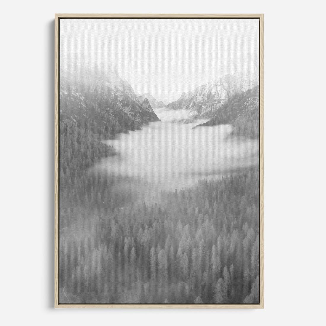 Ten obraz przedstawia uroczy i tajemniczy pejzaż, gdzie zamglone góry i las tworzą malowniczy krajobraz. Odcienie szarości i delikatna mgła nadają kompozycji niepowtarzalny charakter. To dzieło sztuki przeniesie widza w spokojny świat natury, zachęcając do chwili refleksji i kontemplacji. Idealny wybór dla miłośników pejzaży i minimalistycznego piękna.