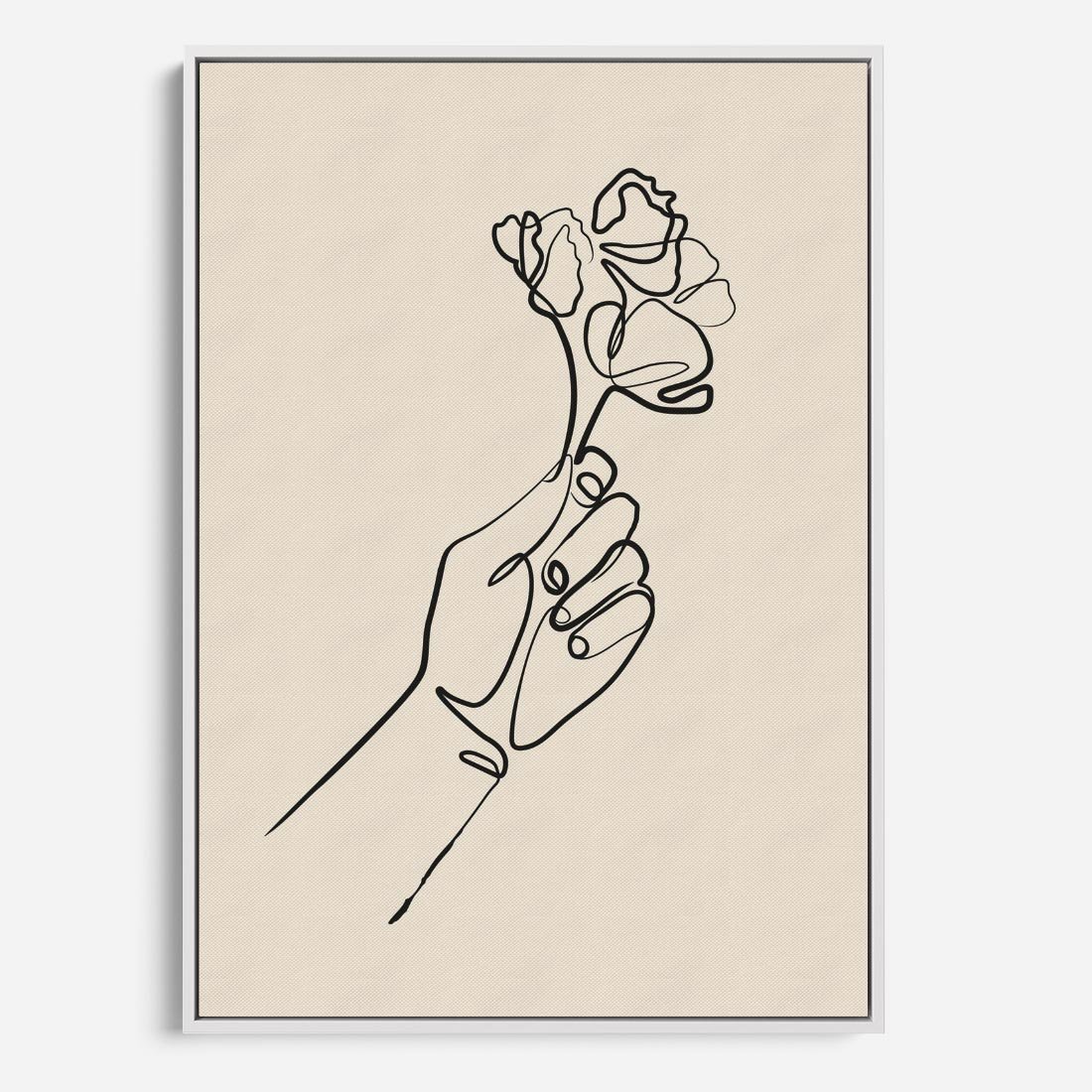 Ten czarno-biały szkic ukazuje minimalistyczną kreskę kwiatu trzymanego w dłoni. Sztuka ta oddaje delikatność i piękno natury poprzez prostotę linii, tworząc wyjątkowy obraz, który zachwyca swoją subtelnością i wdziękiem, stanowiąc minimalistyczny akcent z odrobiną natury w Twojej przestrzeni.