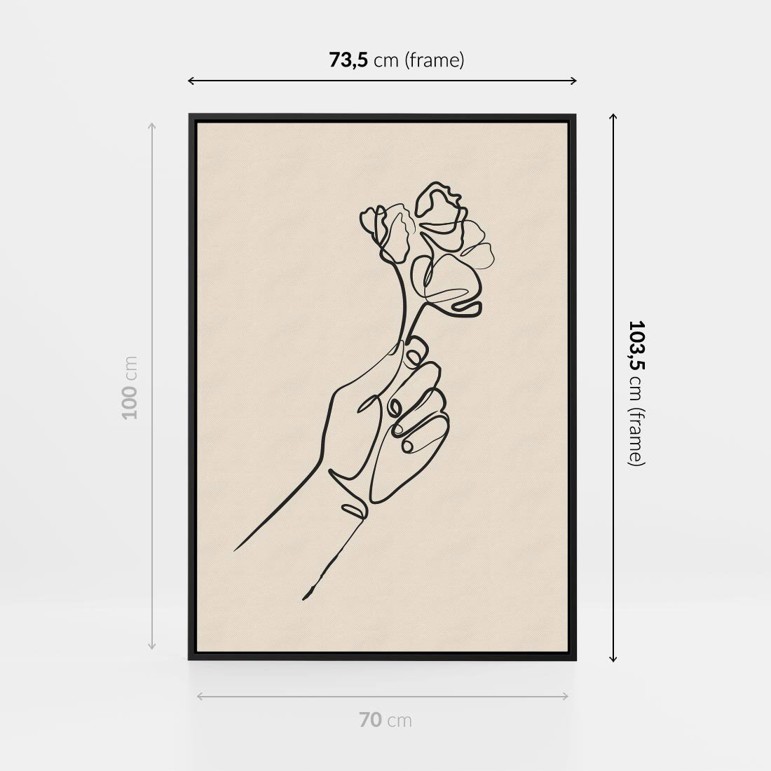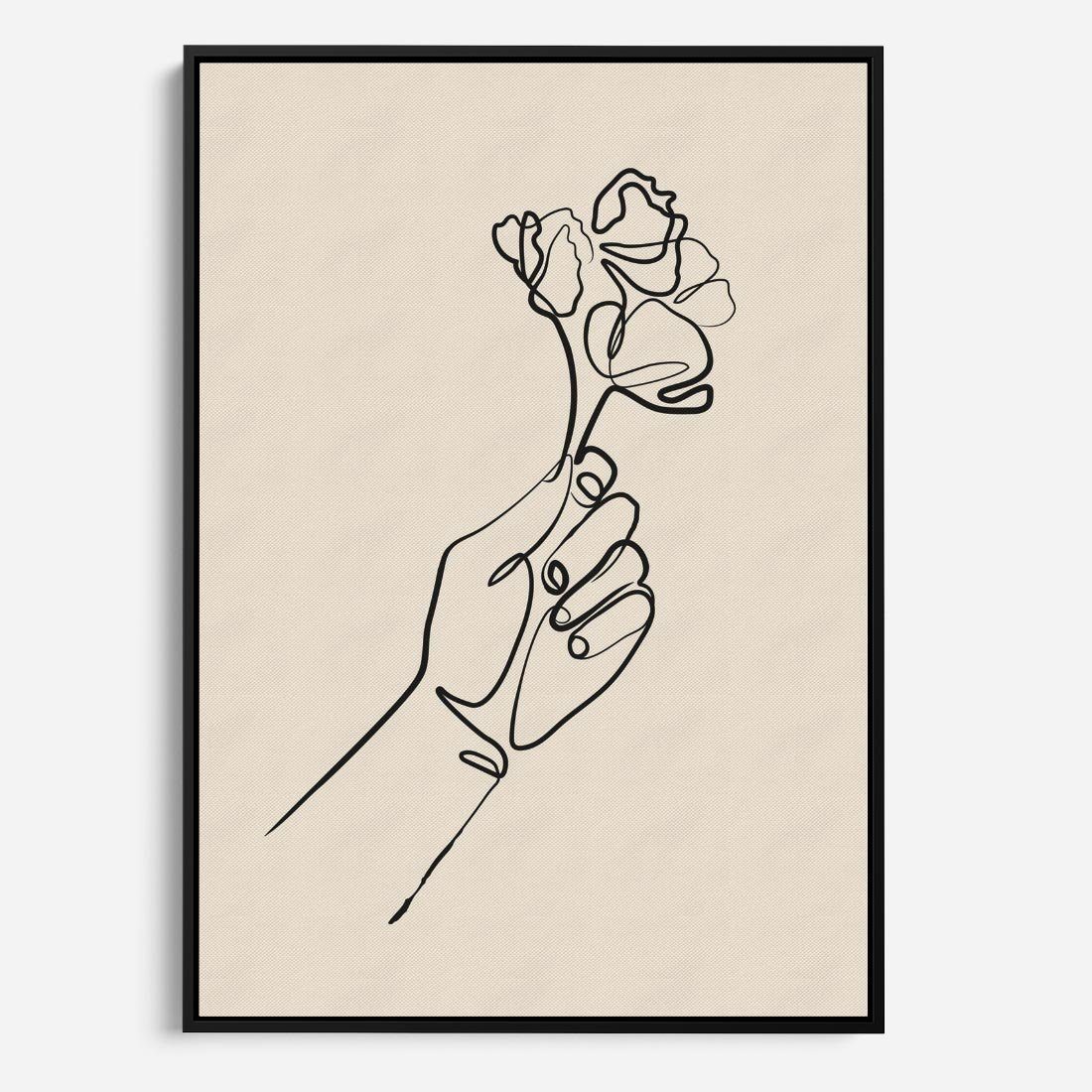 Ten czarno-biały szkic ukazuje minimalistyczną kreskę kwiatu trzymanego w dłoni. Sztuka ta oddaje delikatność i piękno natury poprzez prostotę linii, tworząc wyjątkowy obraz, który zachwyca swoją subtelnością i wdziękiem, stanowiąc minimalistyczny akcent z odrobiną natury w Twojej przestrzeni.
