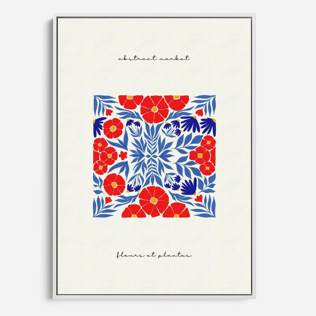 Ta nowoczesna kwiatowa kompozycja łączy odważne odcienie czerwieni i niebieskiego, w harmonii z delikatną typografią. Sztuka ta tworzy dynamiczną i ekspresyjną przestrzeń, łącząc piękno natury z mocą słów.