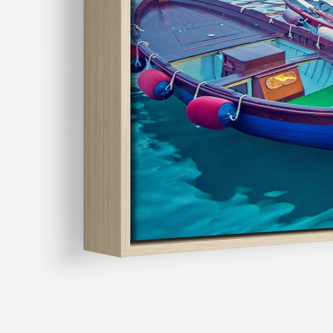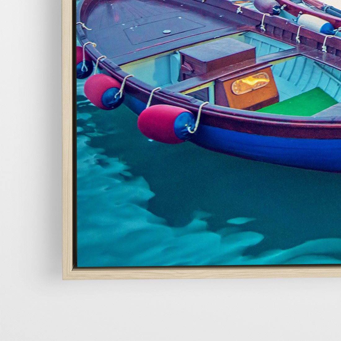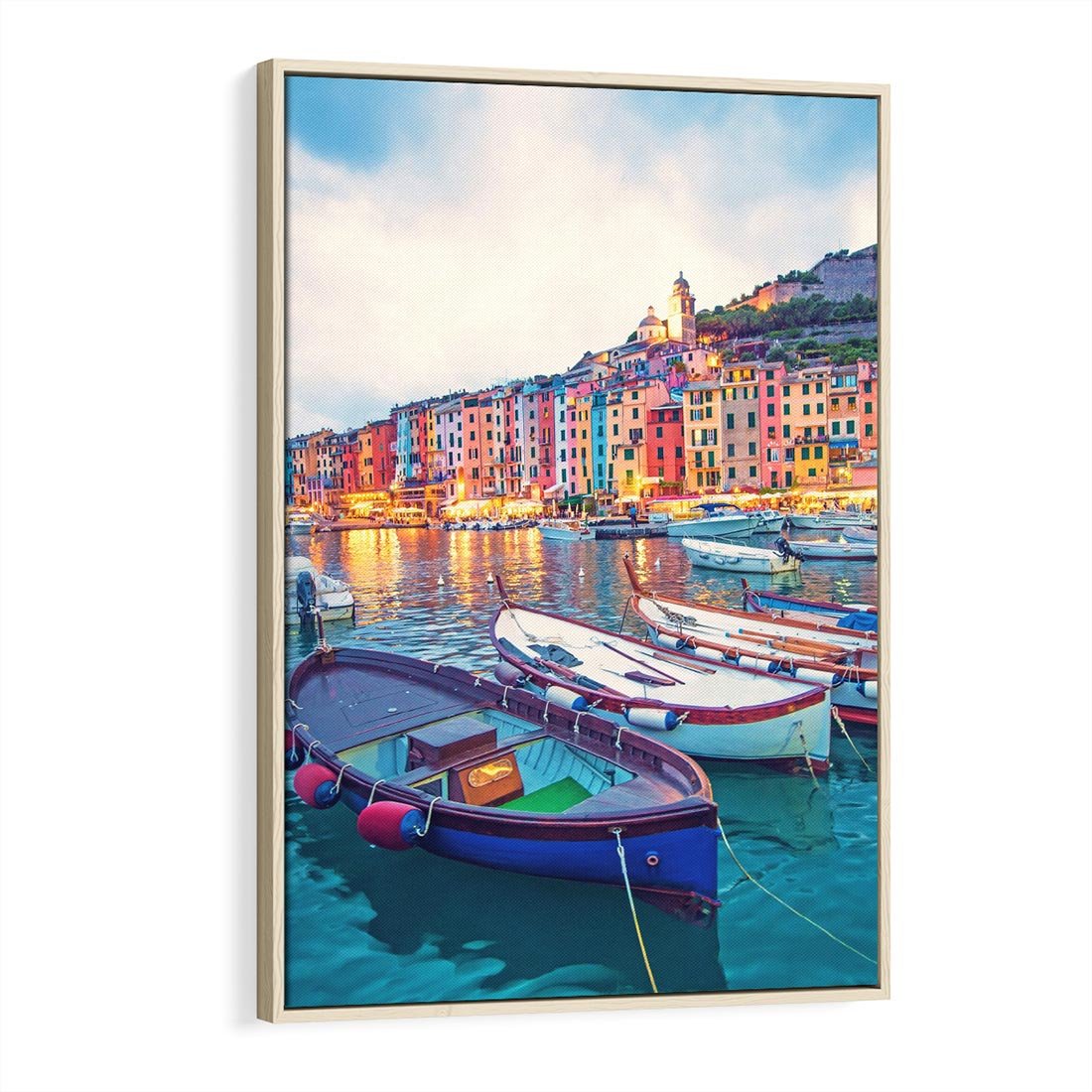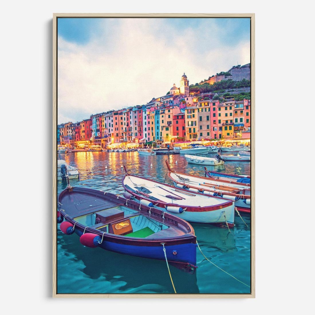 To malowniczy pejzaż przedstawiający nadmorskie miasto ożywione bogatą paletą barw. Budynki w jaskrawych kolorach zdobią brzeg, a port tętni życiem z kolorowymi łodziami. Wieczorne latarnie rozświetlają to idylliczne miejsce, nadając mu romantyczny nastrój. Ten obraz przenosi widza w magiczny krajobraz pełen kolorów i uroku nadmorskiego miasteczka. Idealny dla miłośników podróży i pięknych widoków.