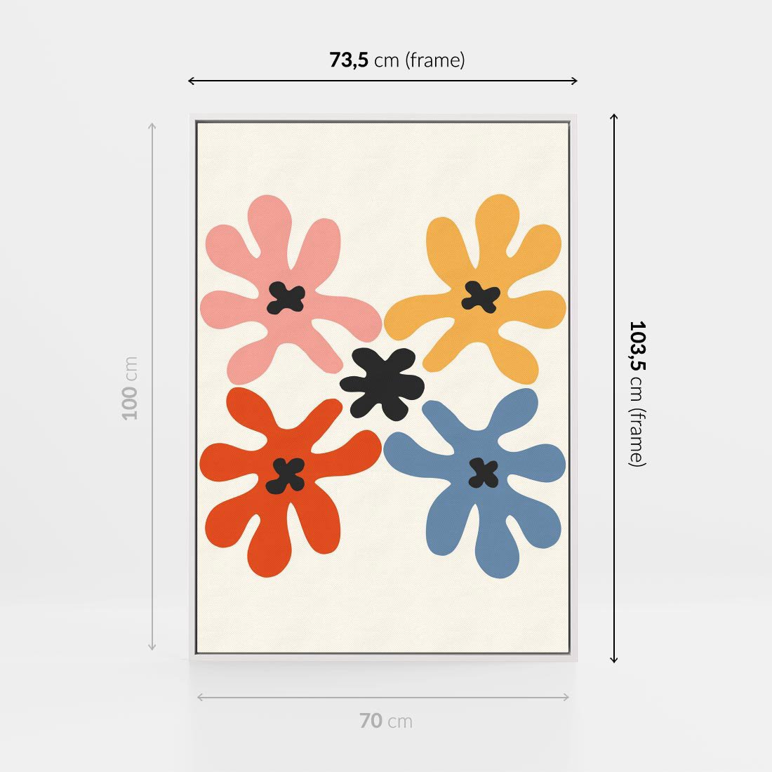Ten minimalistyczny obraz przedstawia abstrakcyjne wielokolorowe kwiaty o dziwnych, intrygujących formach. Wykorzystując minimalizm, tworzy unikalny efekt wizualny, który ożywi i urozmaici każde wnętrze.