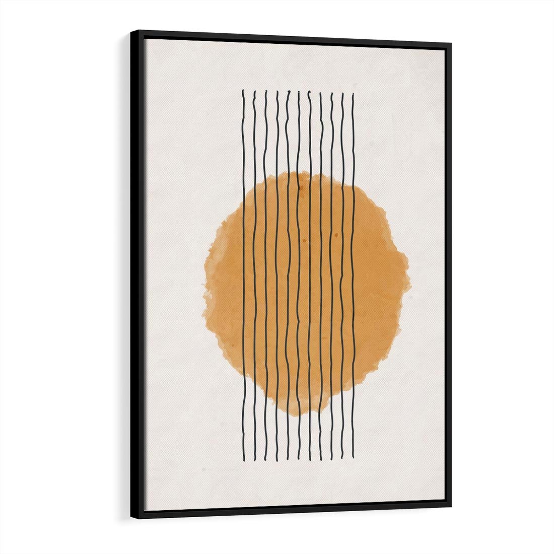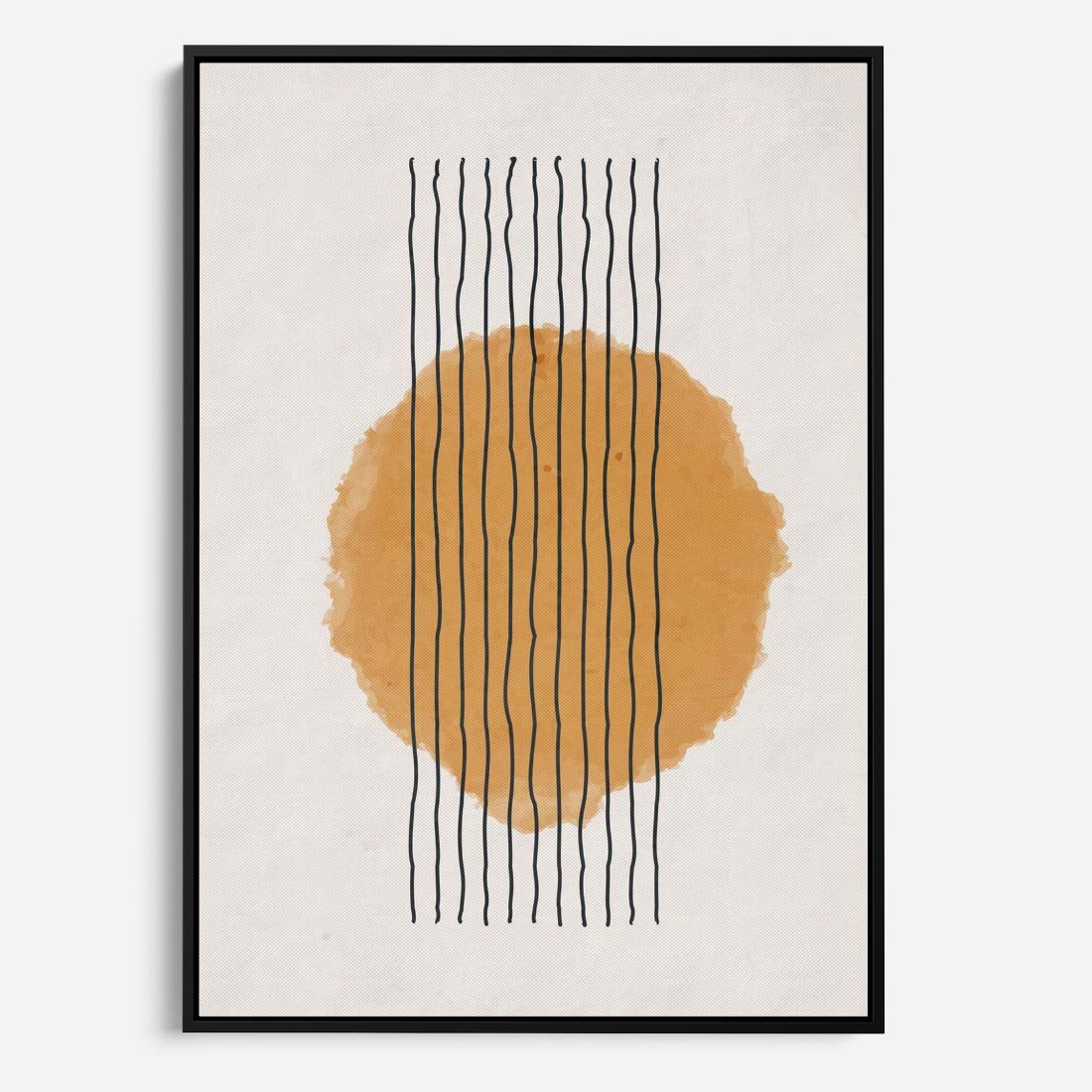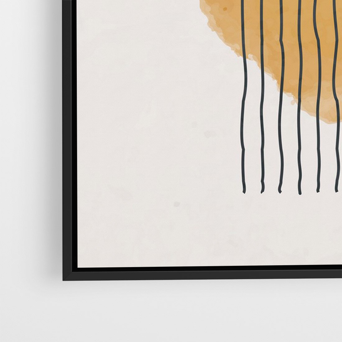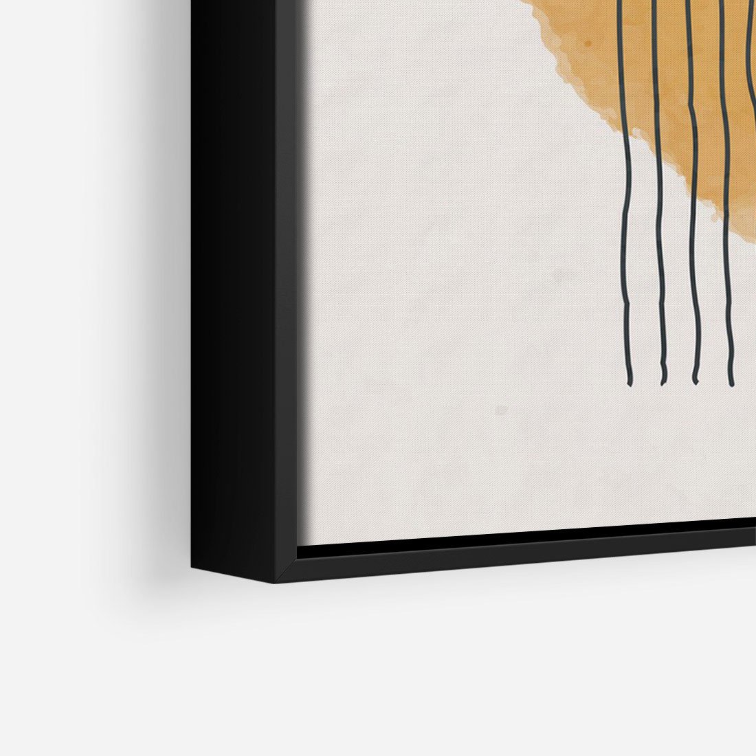 Intrygujący plakat przedstawia abstrakcyjne akwarelowe plamy w intensywnym żółtym kolorze, wzbogacone nieregularnymi kreskami i minimalistycznymi liniami. Nowoczesna sztuka w pełnej krasie.