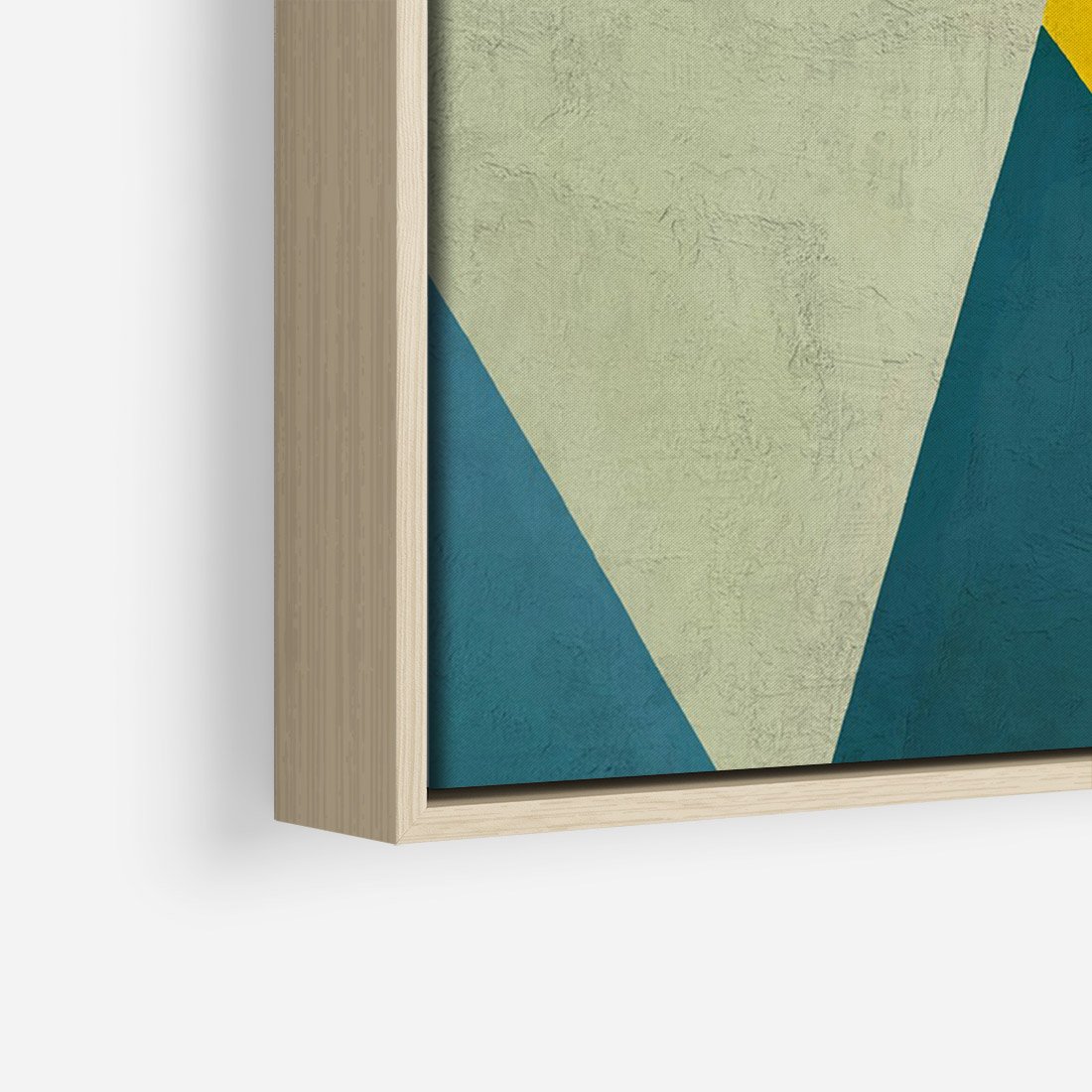 Ten olejny obraz to zaskakująca kompozycja abstrakcyjnych geometrycznych kształtów, w tym trójkątów i kół. Delikatne pastelowe kolory nadają mu subtelności i nowoczesności, idealnie wpasowując się w różnorodne wnętrza.