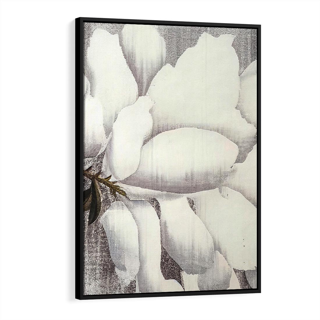 Ten wyjątkowy obraz na płótnie prezentuje białe kwiaty o dużych płatkach, ukazane na delikatnym szarym tle. Kanwa, na której malowano ten kwiatowy motyw, dodaje tekstury i głębi dziełu, nadając mu unikalnego charakteru. To elegancka dekoracja, która wzbogaci Twoje wnętrze o subtelny akcent natury i estetyki.