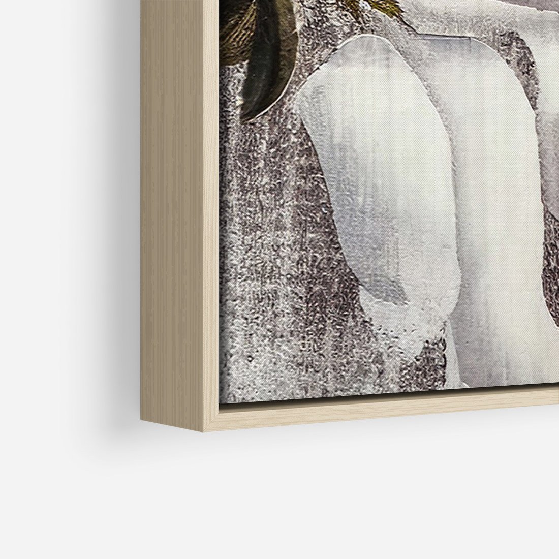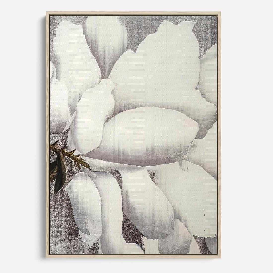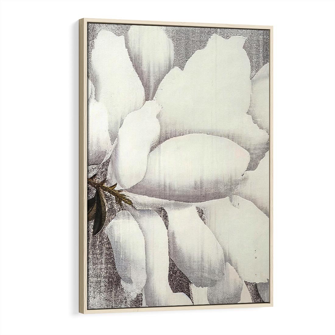 Ten wyjątkowy obraz na płótnie prezentuje białe kwiaty o dużych płatkach, ukazane na delikatnym szarym tle. Kanwa, na której malowano ten kwiatowy motyw, dodaje tekstury i głębi dziełu, nadając mu unikalnego charakteru. To elegancka dekoracja, która wzbogaci Twoje wnętrze o subtelny akcent natury i estetyki.
