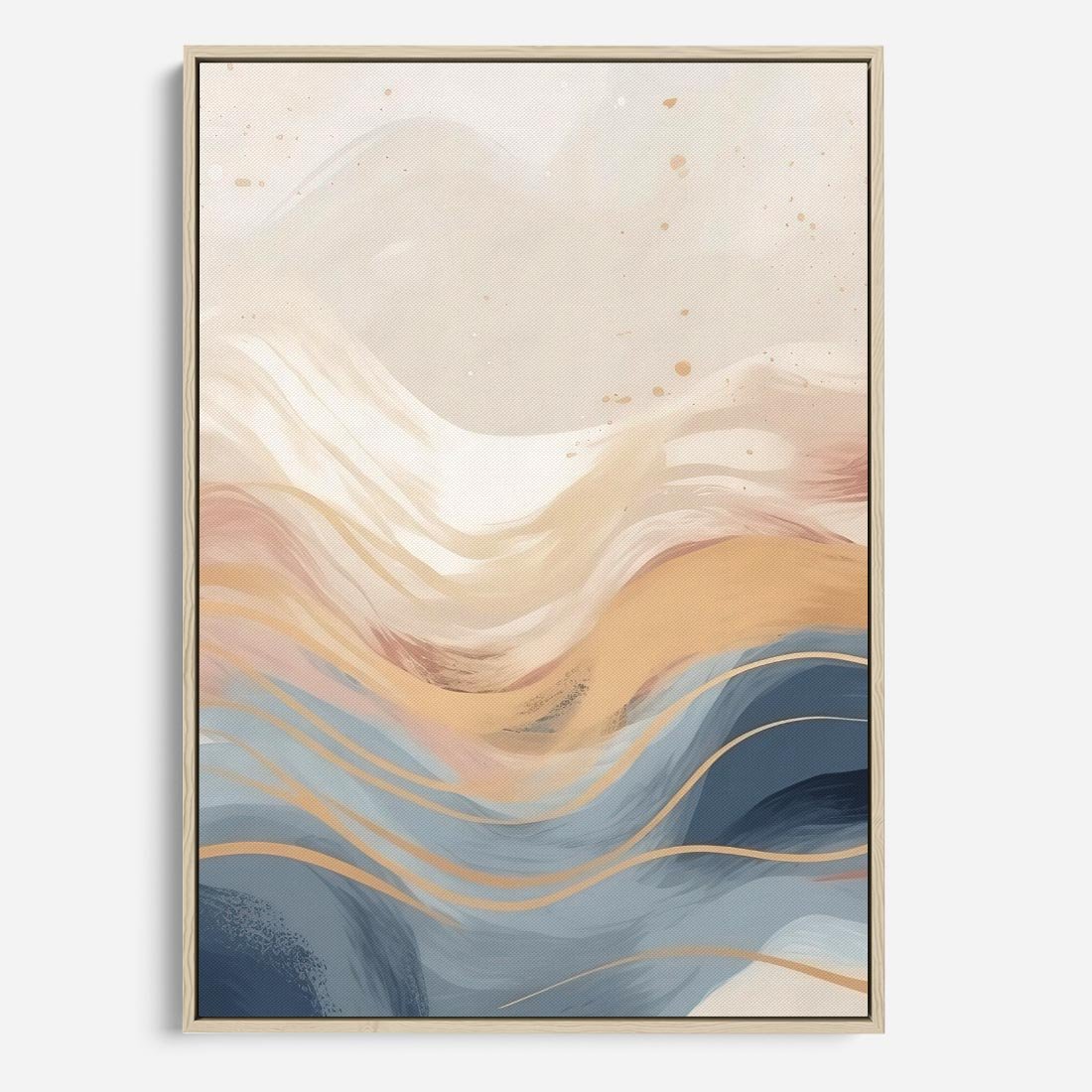 Odkryj elegancję w subtelnych abstrakcyjnych falach na płótnie. Gładkie linie tworzą klasyczne kształty, a delikatne pastelowe kolory dodają przyjemnej atmosfery, idealnej do ozdobienia Twojego domu.