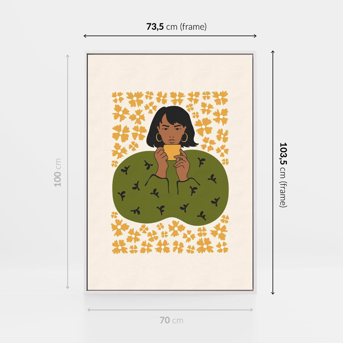Obraz w ramie 70x100 - Wewnętrzne Fale - nowoczesny plakat, kobieta otoczona liśćmi - rama biała