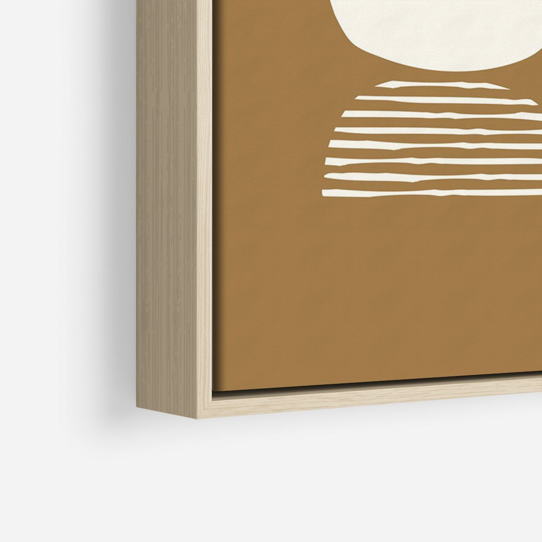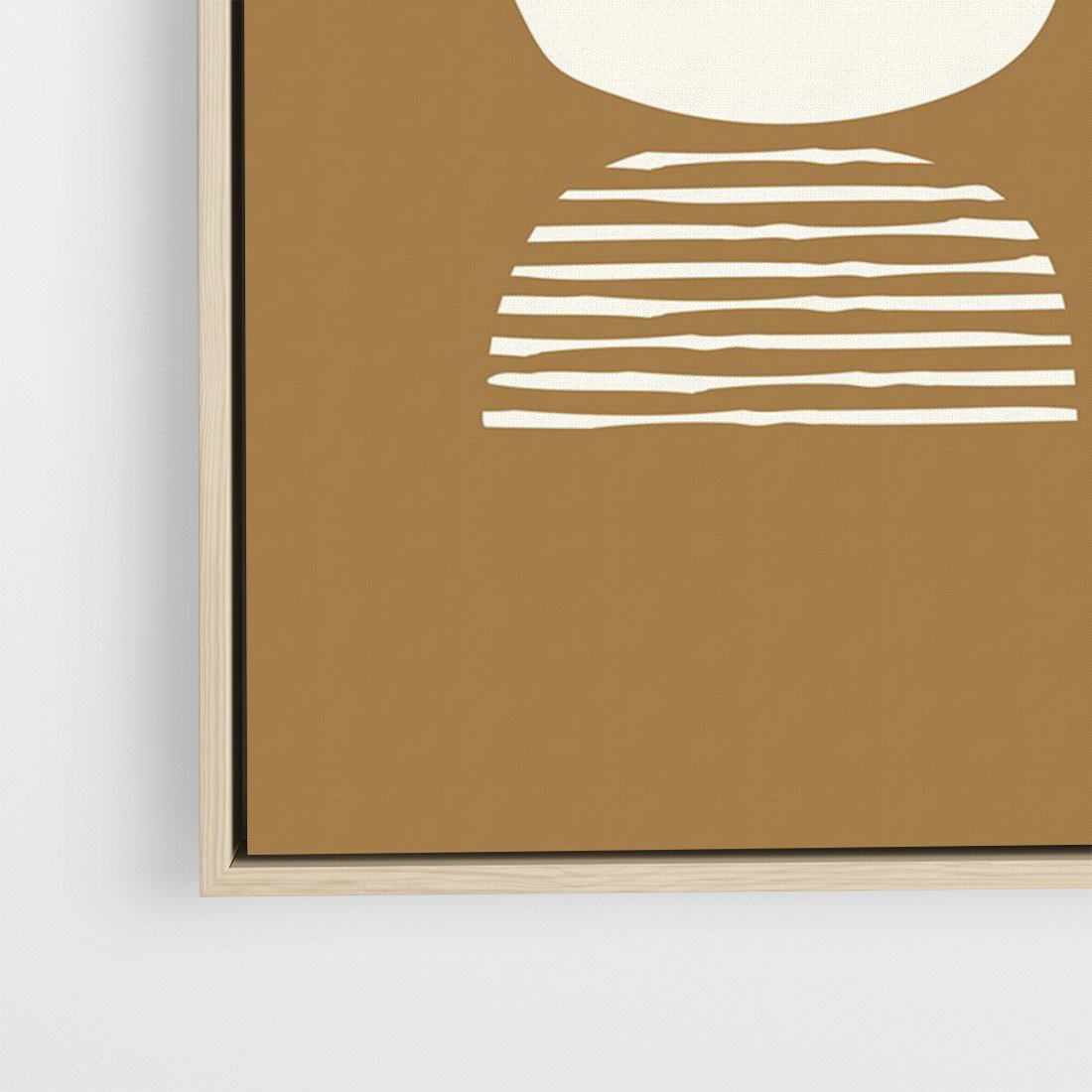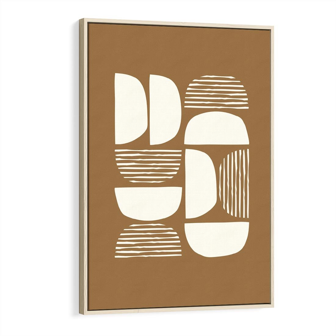 Ten plakat łączy geometryczne boho kształty z minimalistycznym podejściem, prezentując je na ciepłym brązowym, karmelowym tle. Sztuka ta tworzy harmonijną równowagę między różnymi stylami, wprowadzając do Twojej przestrzeni elegancki akcent, który emanuje spokojem i estetyką, doskonale wpisując się w minimalistyczne wnętrza.
