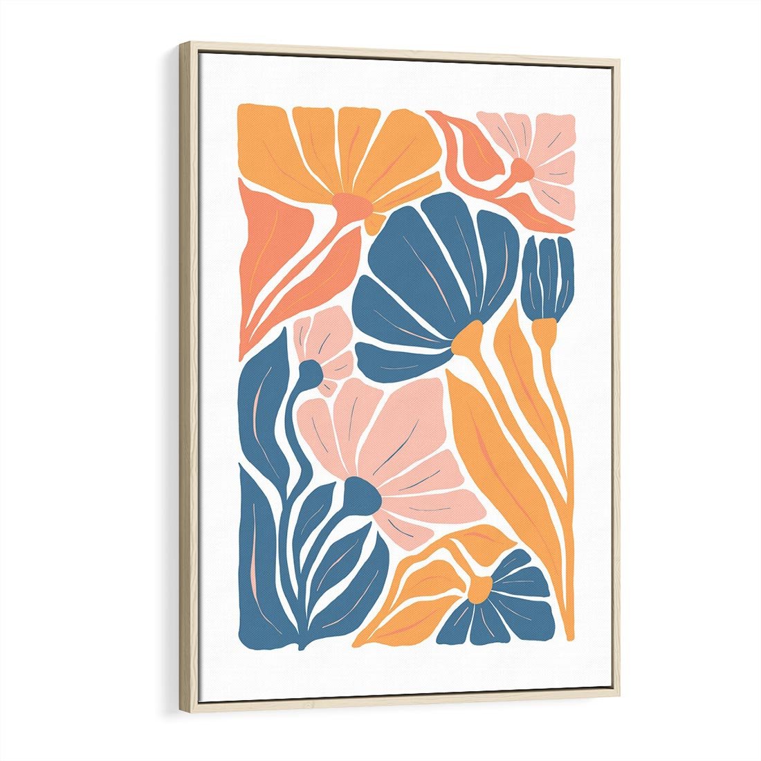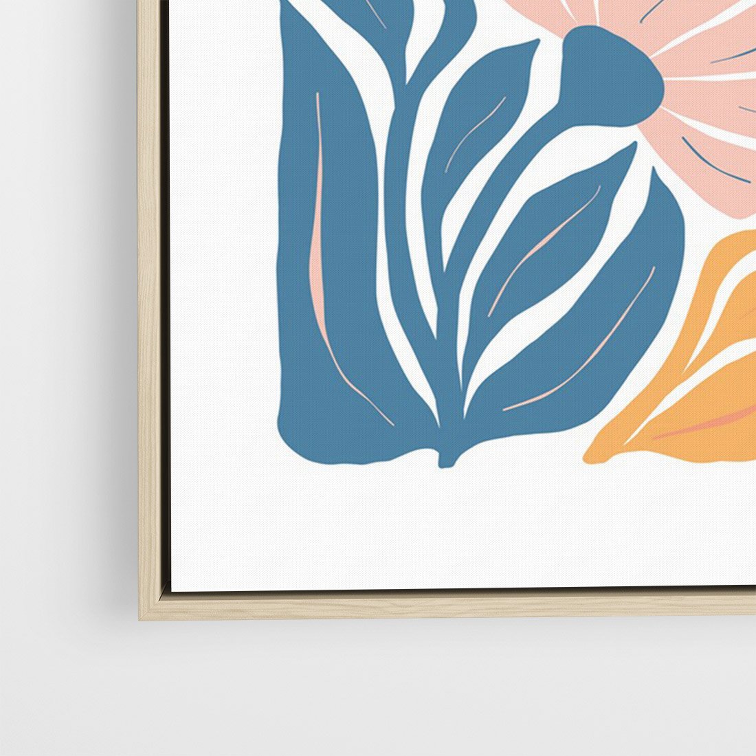 Ta nowoczesna grafika w pastelowych odcieniach niebieskiego, pomarańczowego i różowego ożywia przestrzeń kwiatowym urokiem. To dynamiczna kompozycja, która wnosi do wnętrza subtelne i radosne akcenty. Obraz ten jest wspaniałym sposobem na wprowadzenie kolorowej i nowoczesnej energii natury do Twojego otoczenia.