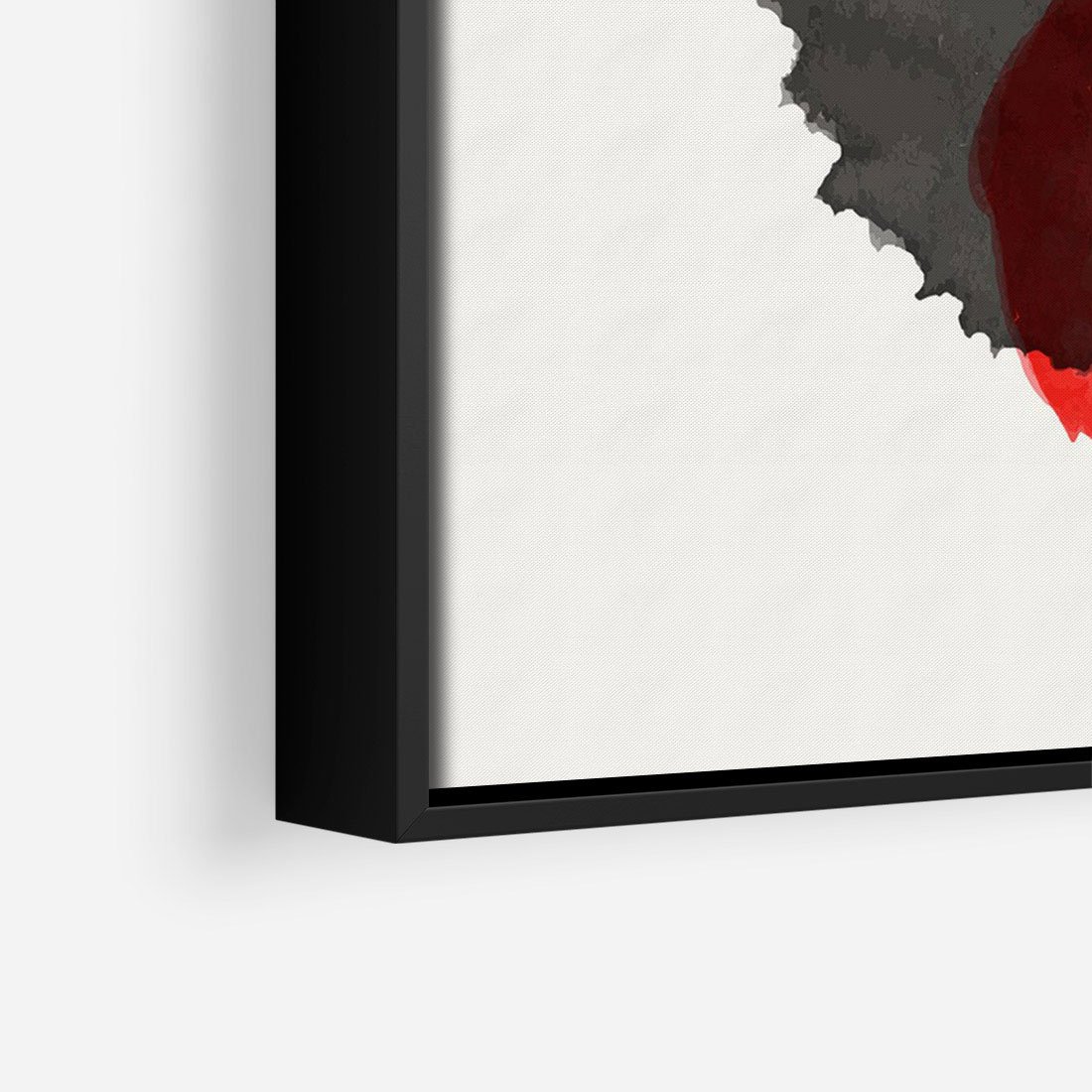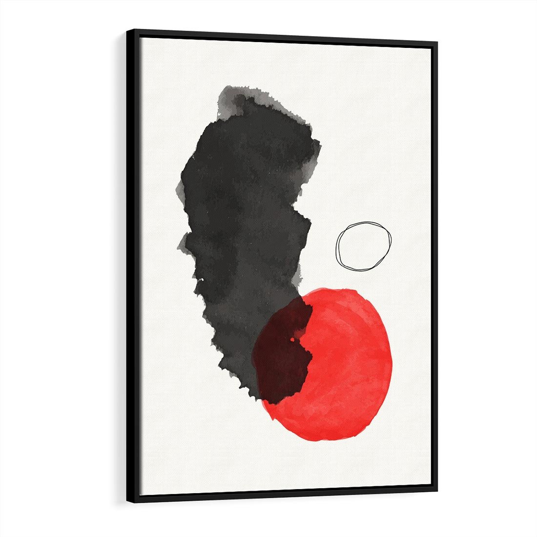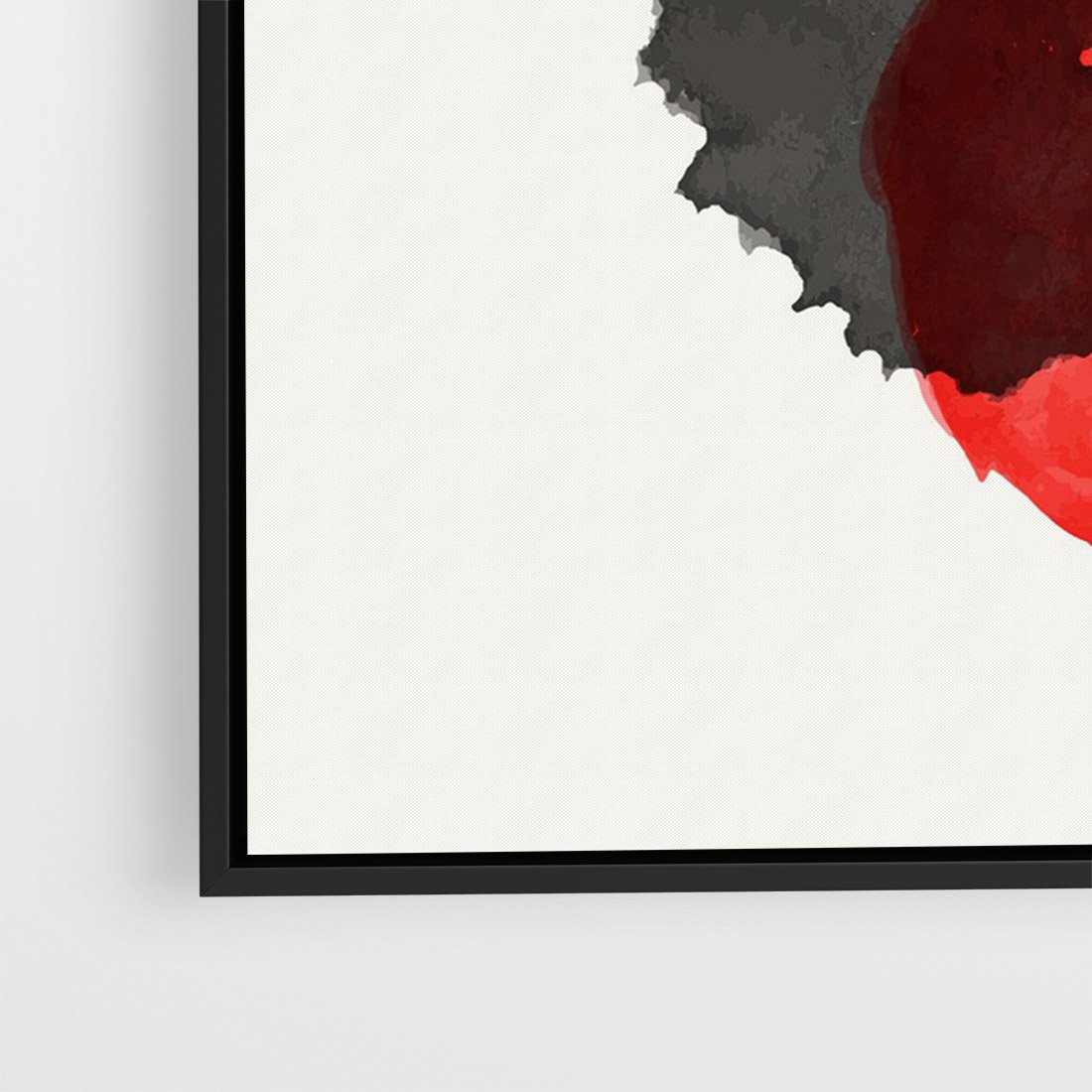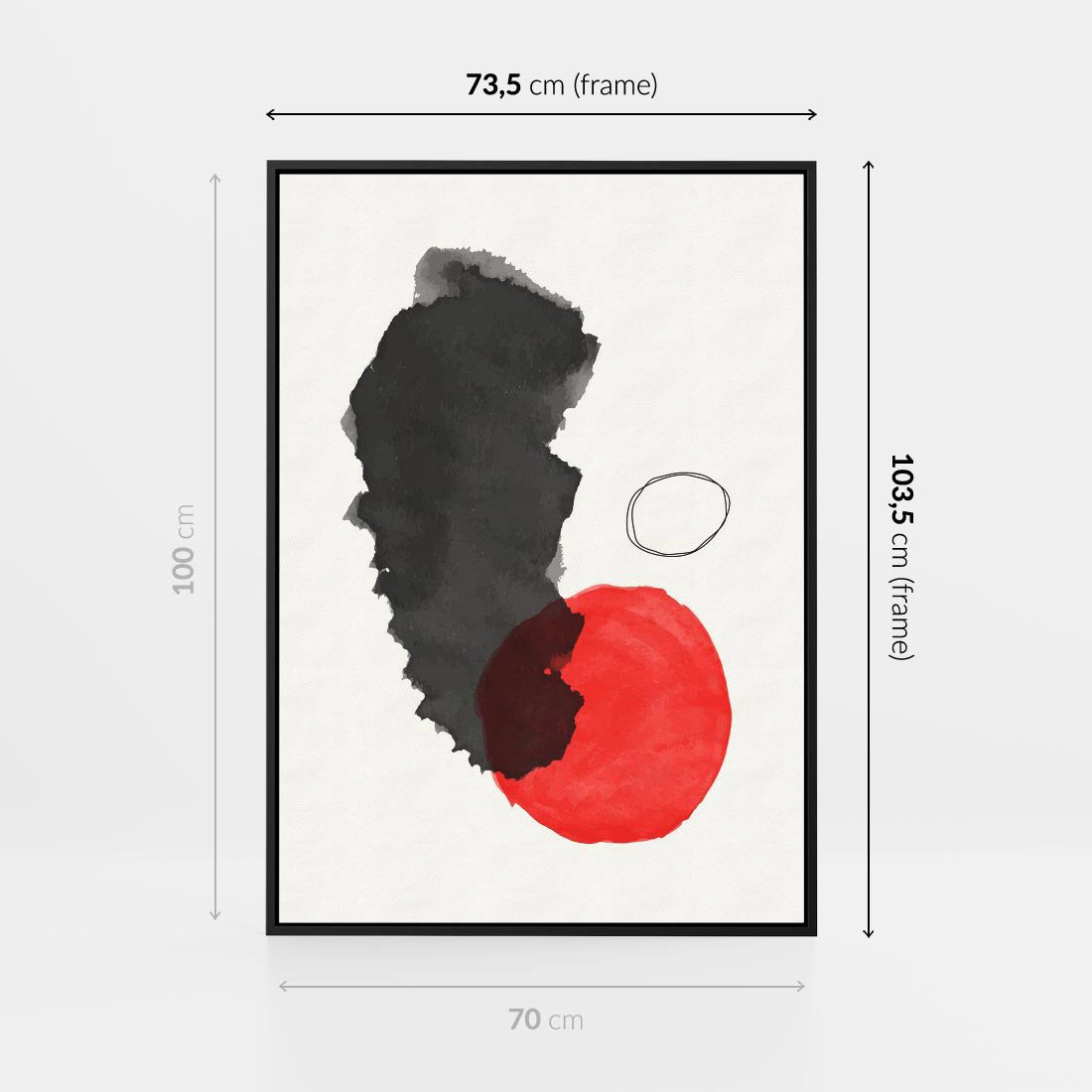 Ten nowoczesny obraz to połączenie abstrakcyjnych, nieregularnych plam w odcieniach czerni, szarości i czerwieni. Minimalistyczny styl nadaje mu elegancję i wyrazistość.