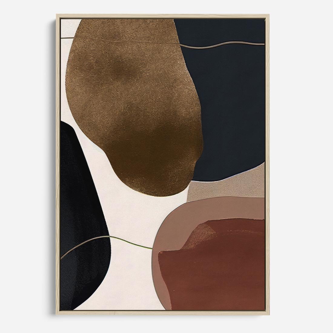 Odkryj abstrakcyjny obraz z nieregularnymi plamami w czarnym, złotym i brązowym na beżowym tle. Złote linie kreski dodają elegancji. Dla miłośników sztuki poszukujących wyjątkowych dzieł do nowoczesnych i klasycznych wnętrz.