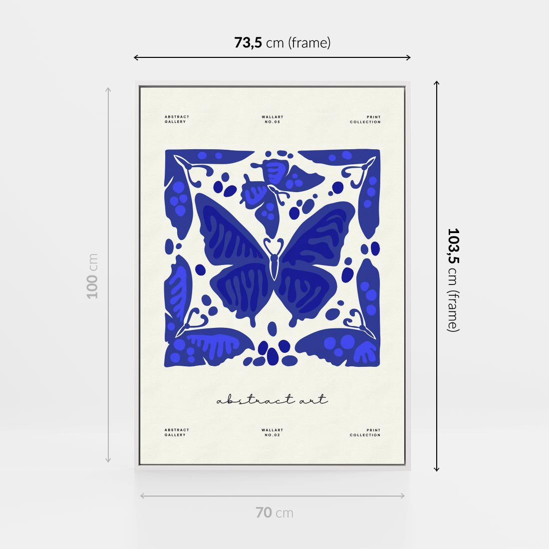 Ten nowoczesny plakat w odcieniach błękitu przedstawia abstrakcyjne motyle, tworząc hipnotyzującą kompozycję. Delikatność motywów kontrastuje z nowoczesnym stylem, tworząc unikalne wrażenie.