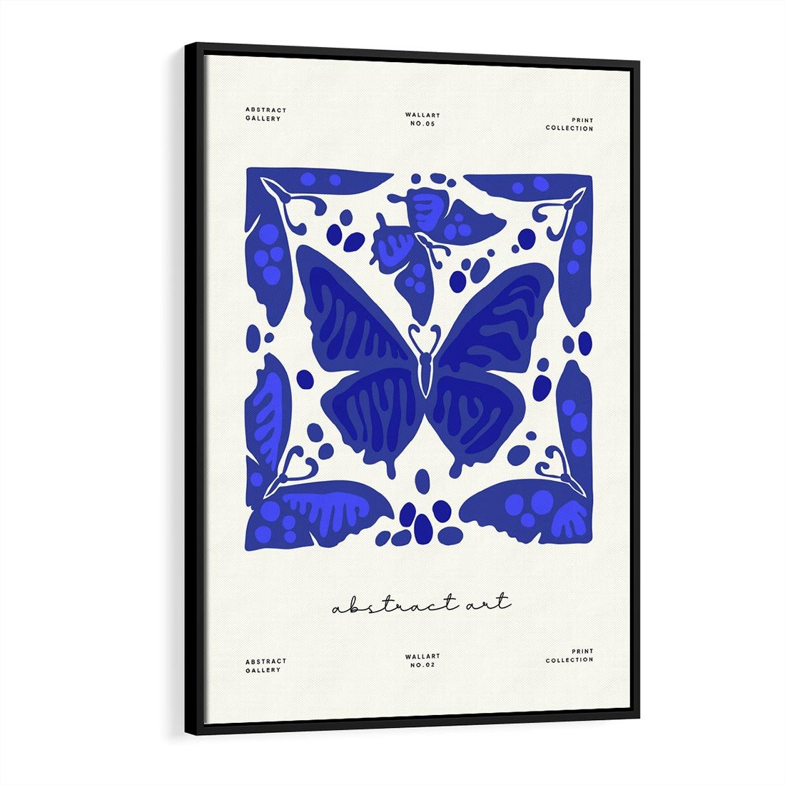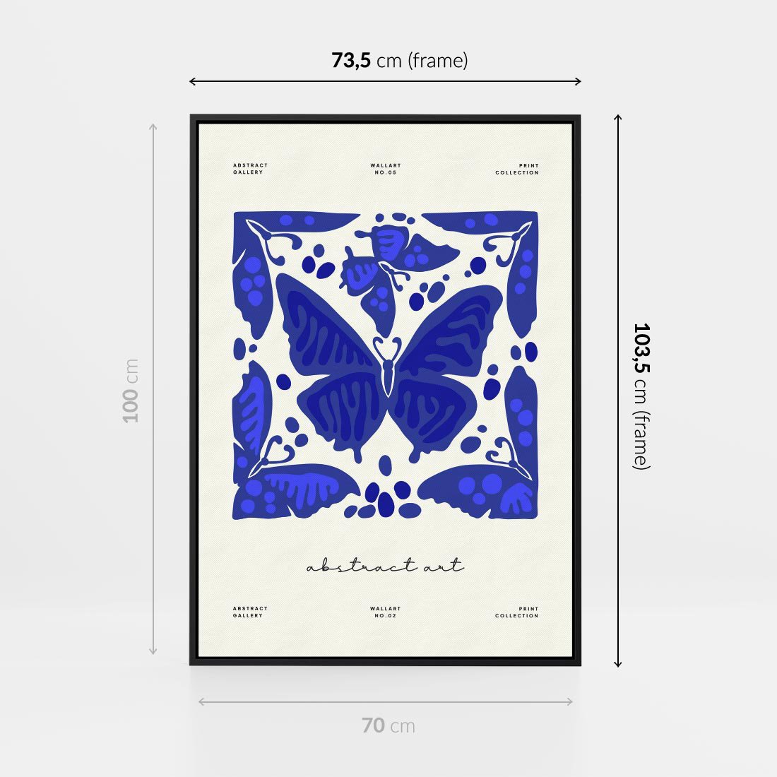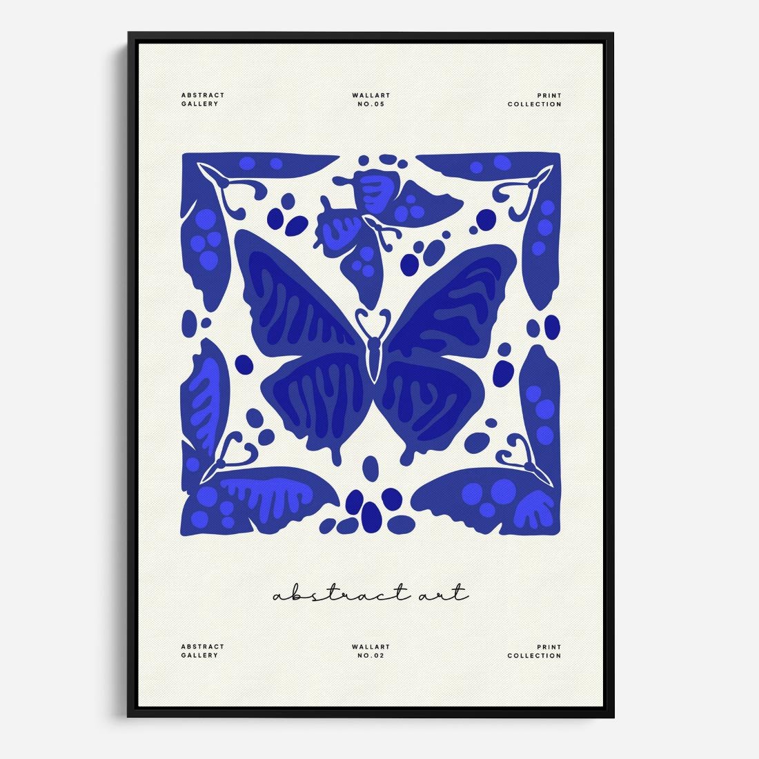 Ten nowoczesny plakat w odcieniach błękitu przedstawia abstrakcyjne motyle, tworząc hipnotyzującą kompozycję. Delikatność motywów kontrastuje z nowoczesnym stylem, tworząc unikalne wrażenie.
