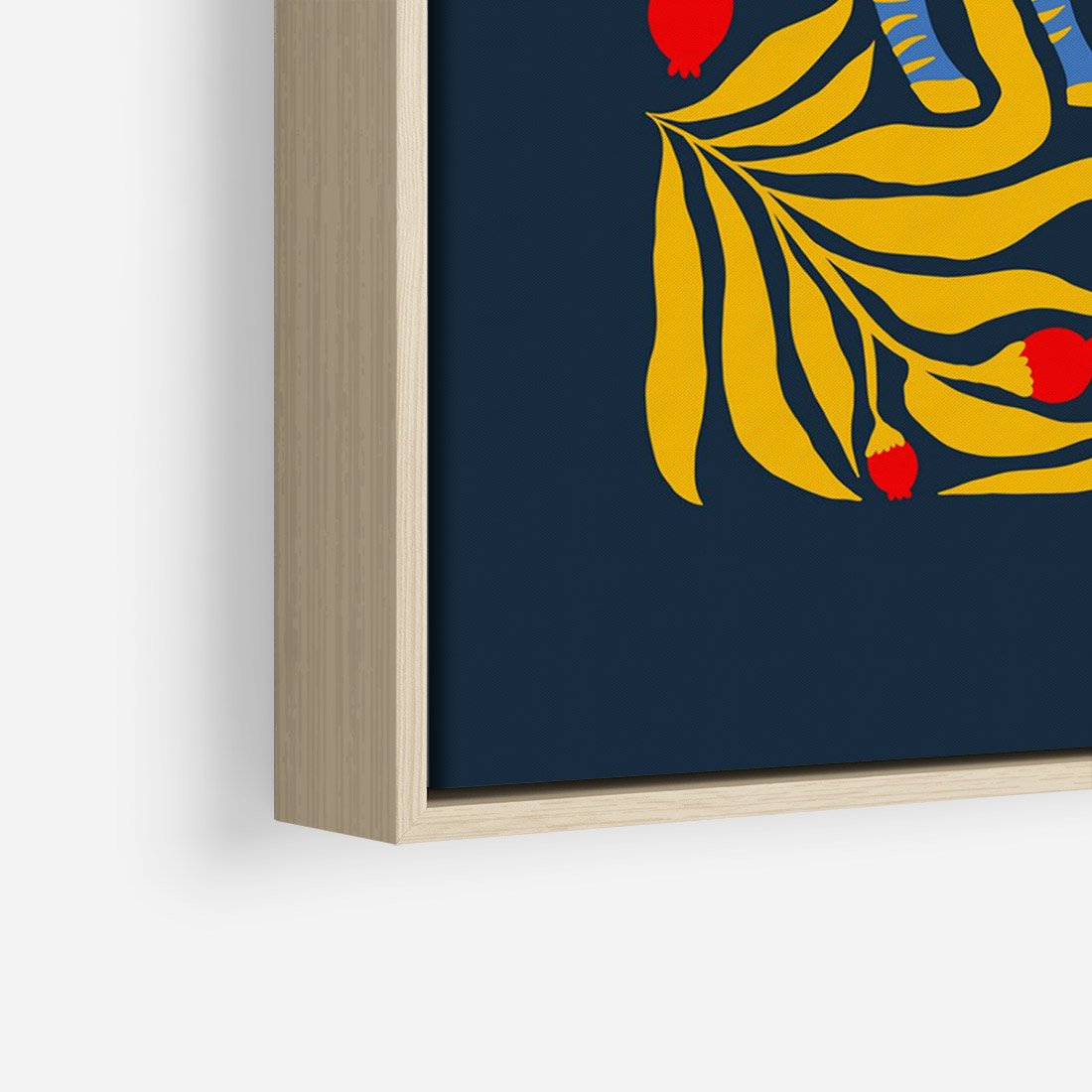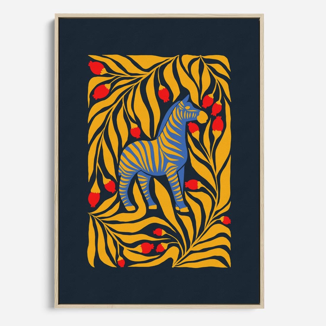Ta nowoczesna sztuka przedstawia zebrę na granatowym tle, w otoczeniu żółtych roślin. Kompozycja tworzy wyjątkowy kontrast między zwierzęciem a roślinami, zachęcając do odkrywania piękna natury w nowatorski sposób.