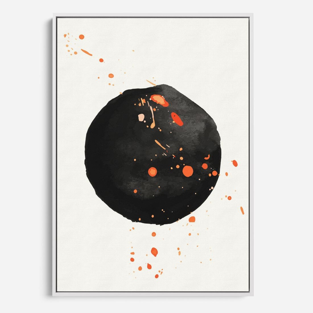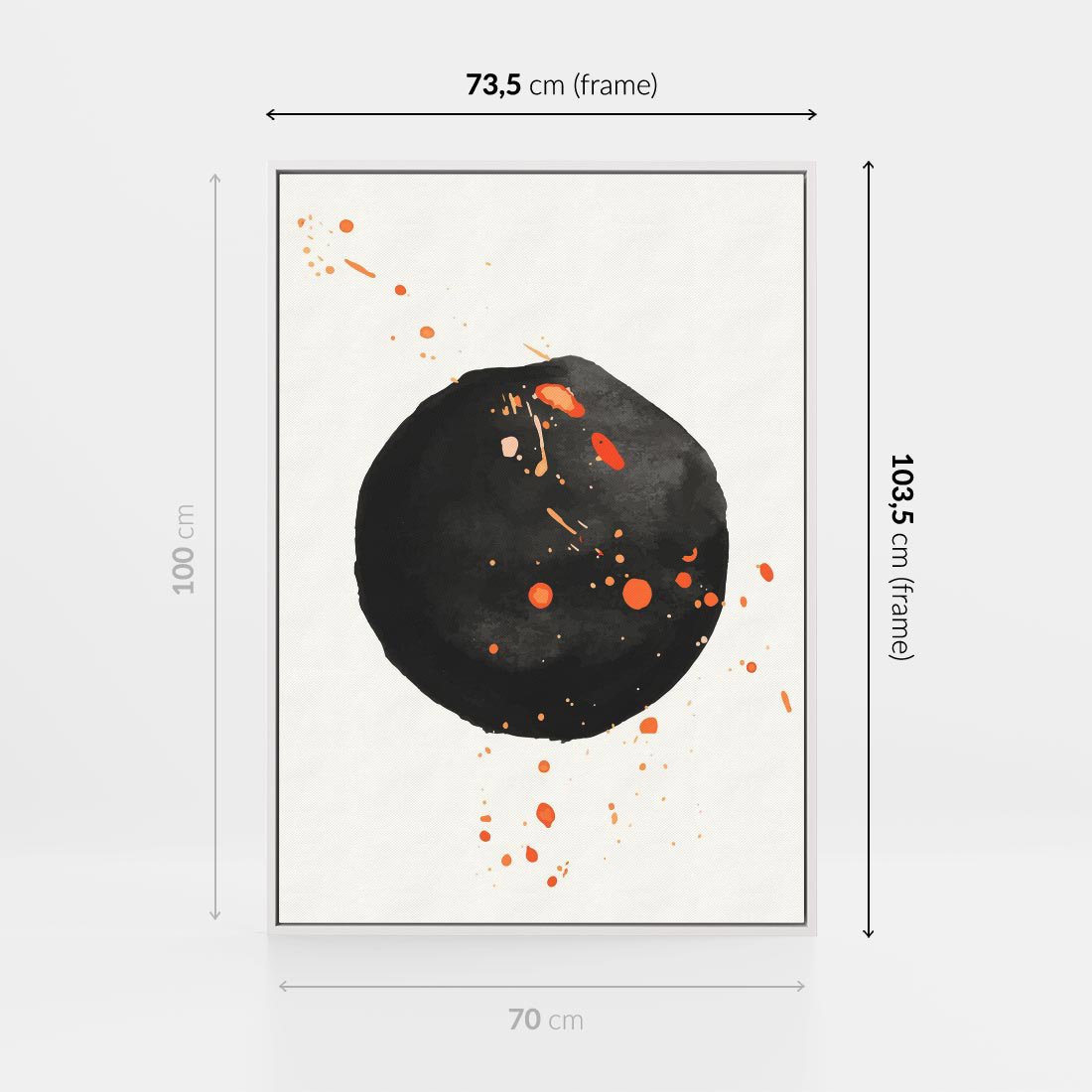 Obraz w ramie 70x100 - Wnętrza Marzeń - abstrakcyjna czarna plama, rozsiane pomarańczowe kropki - rama biała