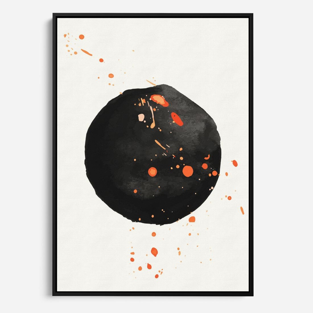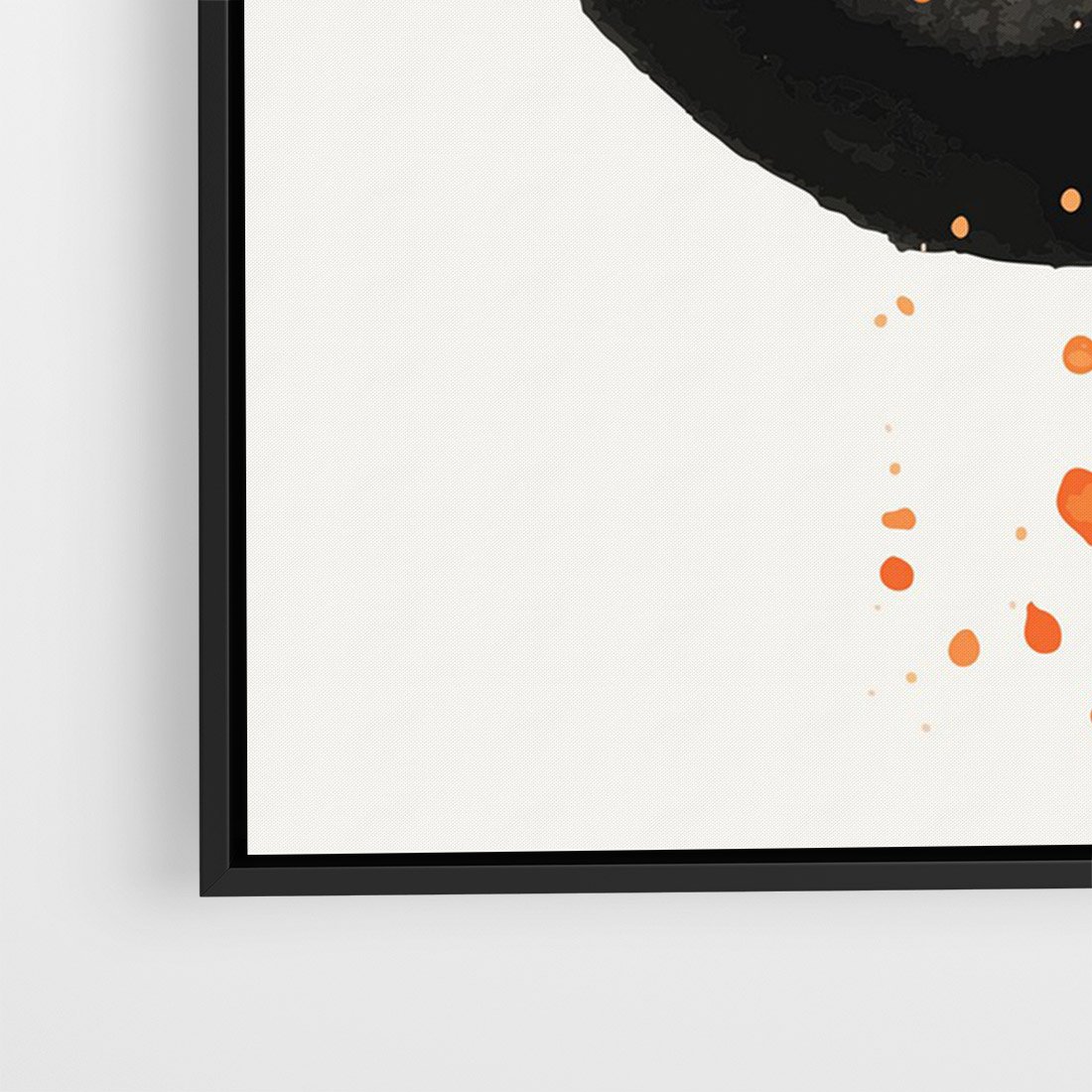 Oryginalny obraz to połączenie abstrakcyjnej czarnej plamy z delikatnie rozsianymi pomarańczowymi kropkami. Minimalistyczny styl i mocny akcent tworzą wyjątkową nowoczesną sztukę.
