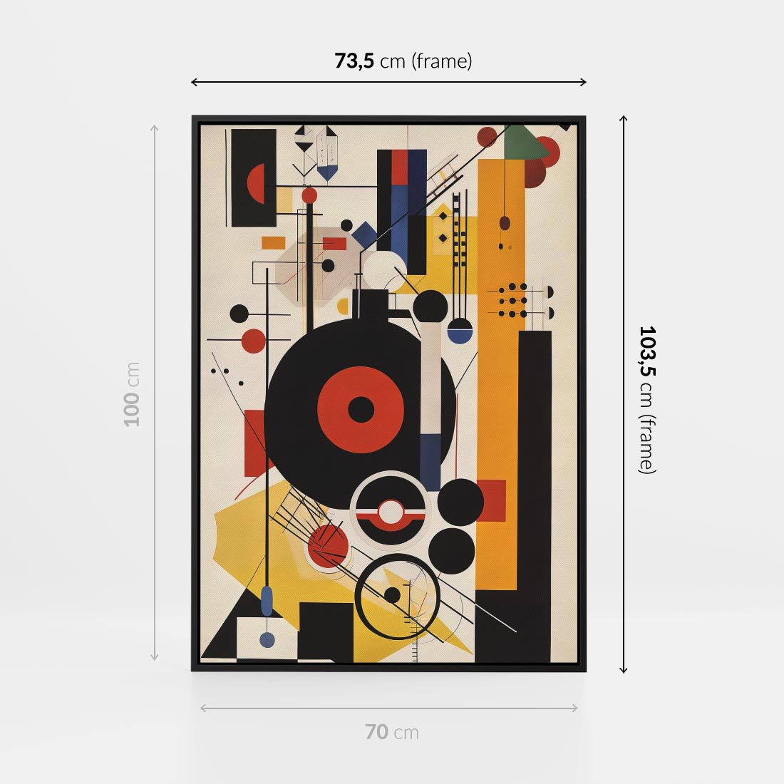 Ten modernistyczny obraz w stylu Bauhaus charakteryzuje się wyraźną geometrią, odważnymi kolorami i abstrakcyjną kompozycją. To hołd dla ducha kreatywności i eksperymentów znanego z ruchu Bauhaus.