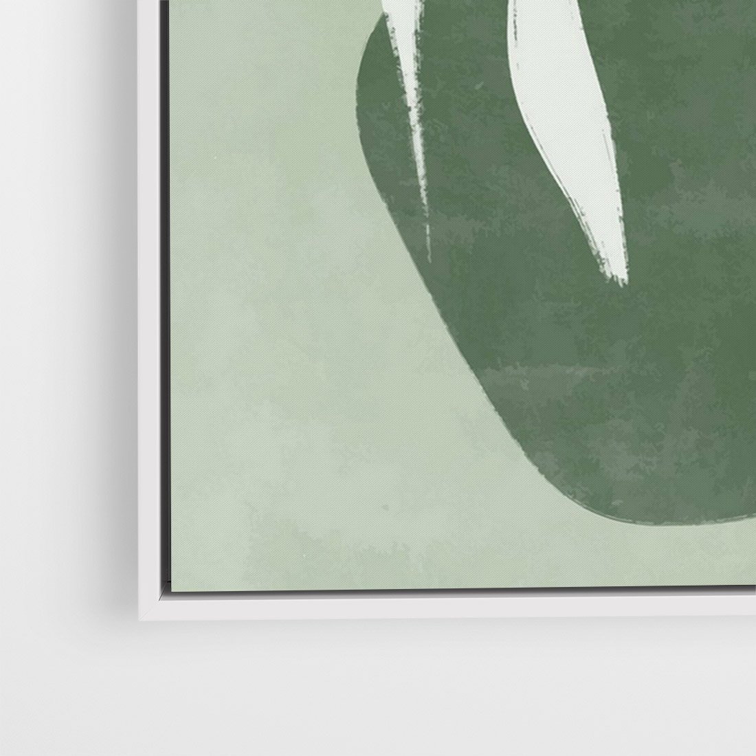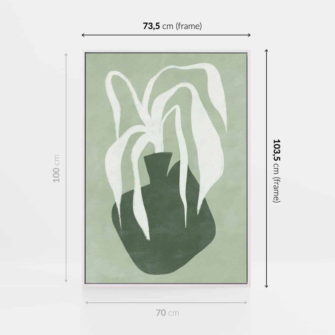 Zielona abstrakcja o zgaszonych odcieniach zieleni to minimalistyczny plakat idealny do wnętrz w stylu skandynawskim. Kwiat w doniczce dodaje subtelności i harmonii, tworząc spokojną i przyjemną atmosferę.