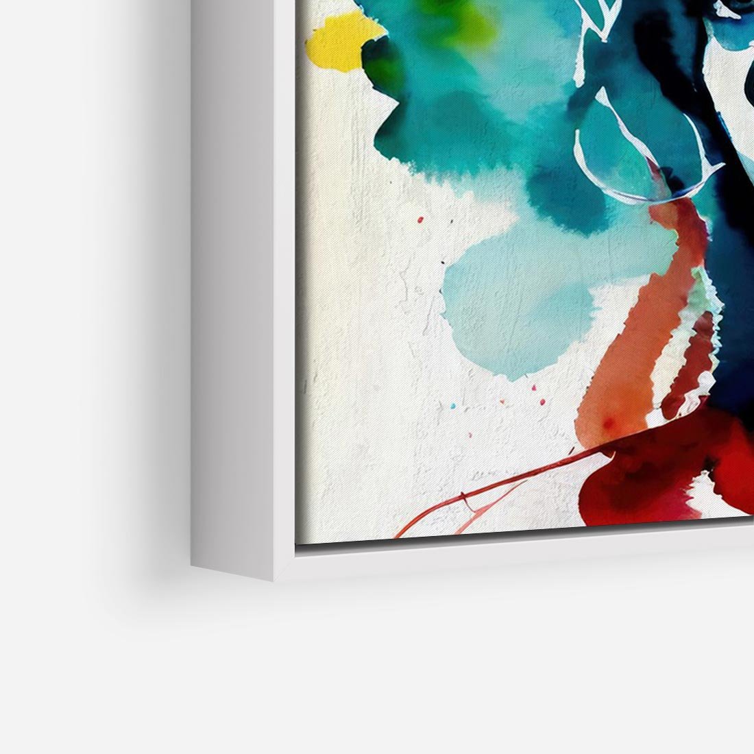 Czarna kreska w abstrakcyjnym portrecie kobiety jest delikatną osią, która kontrastuje z ekspresyjnymi akwarelowymi plamami rozpryśniętymi na płótnie. To zmysłowe połączenie wydobywa osobowość i emocje postaci , tworząc fascynujący taniec formy i koloru.