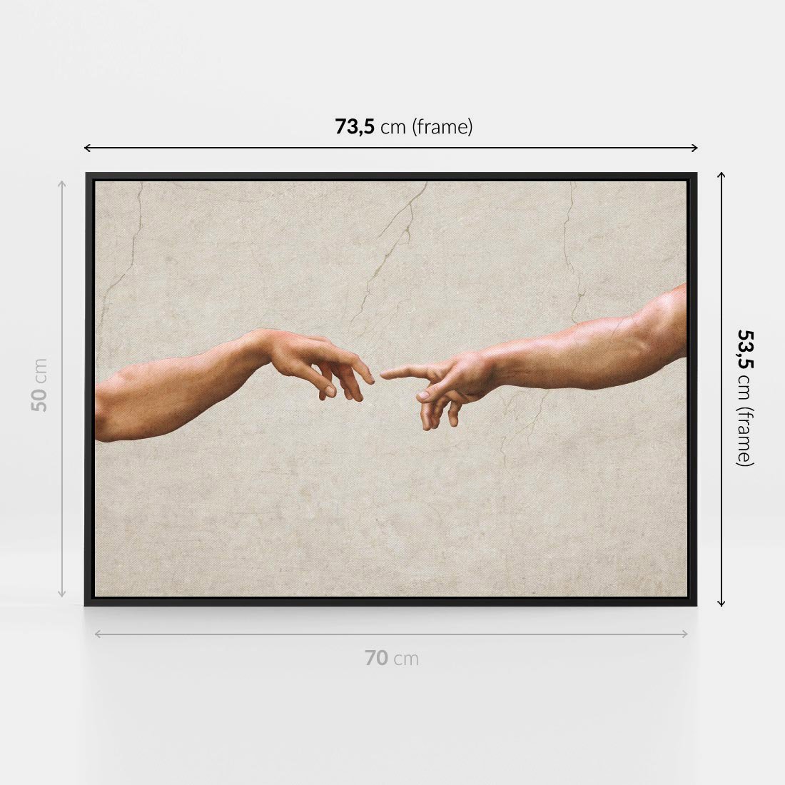Ten wyjątkowy obraz stanowi hołd dla sztuki antyku i Michała Anioła. Ukazuje chwile Stworzenia Adama, gdzie ręka Boga dotyka ludzkiej dłoni. Wyrazista kompozycja i mistyczna atmosfera przyciągają wzrok i inspirują do refleksji nad siłą ducha i piękna boskiej twórczości.