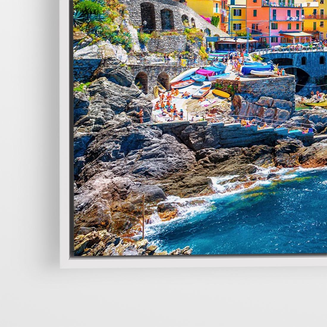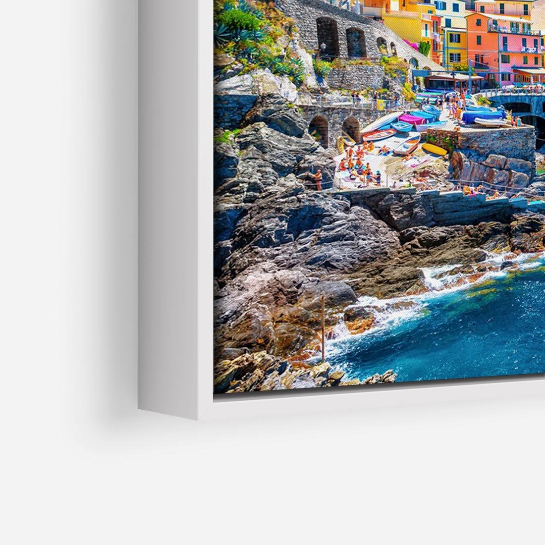 Obraz w ramie 70x50 - Barwne Wybrzeże - nadmorskie miasto na klifie, kolorowe tęczowe budynki - rama biała