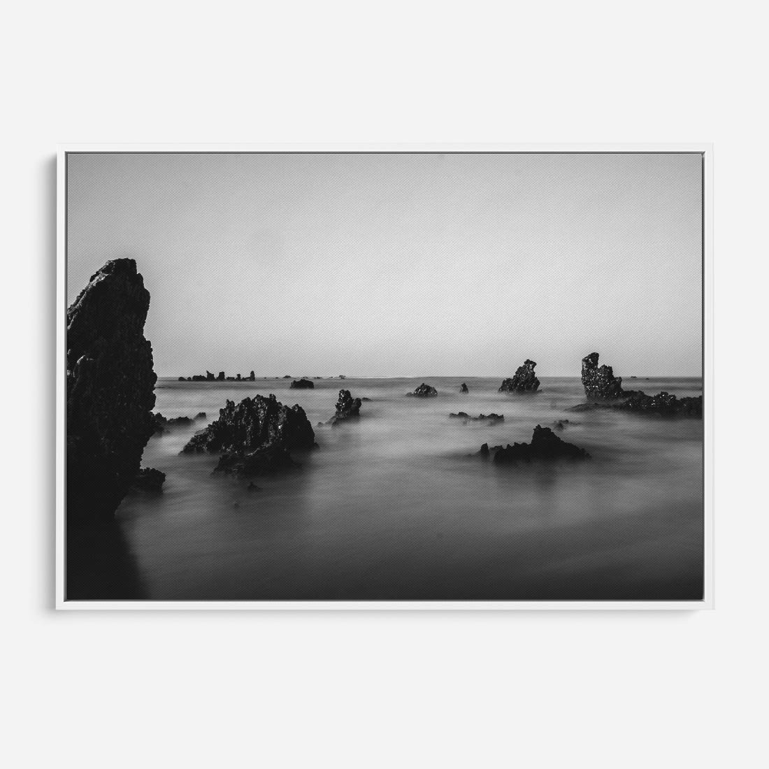 Ta czarno-biała fotografia ukazuje dziką i tajemniczą plażę, gdzie mroczny klimat przeplata się z tajemniczą atmosferą. Skały na brzegu dodają dramatyczności, a zamglony widok dodaje aurze tajemnicy. To pejzaż, który przenosi nas w świat ukrytych historii i nieodkrytych sekretów natury, zapraszając nas do kontemplacji i marzeń.